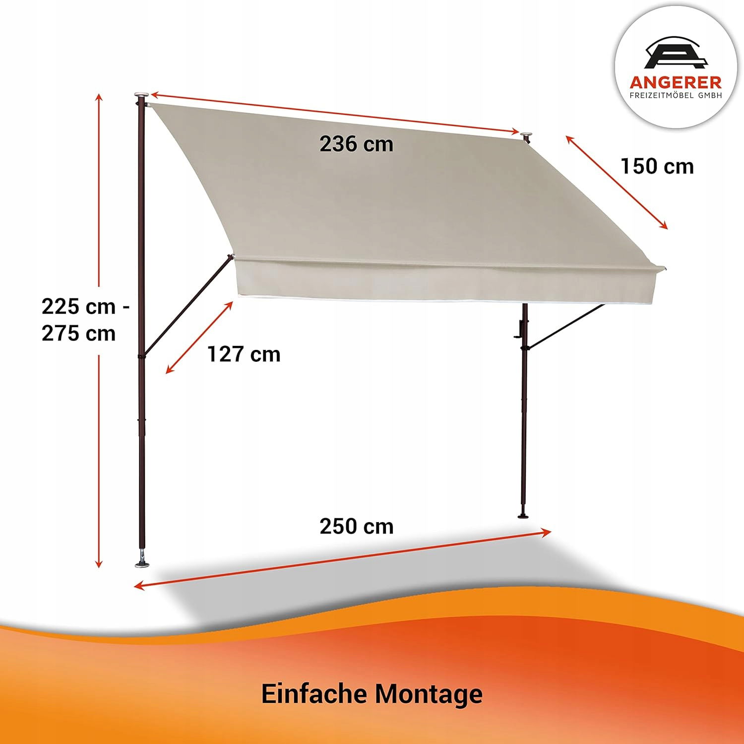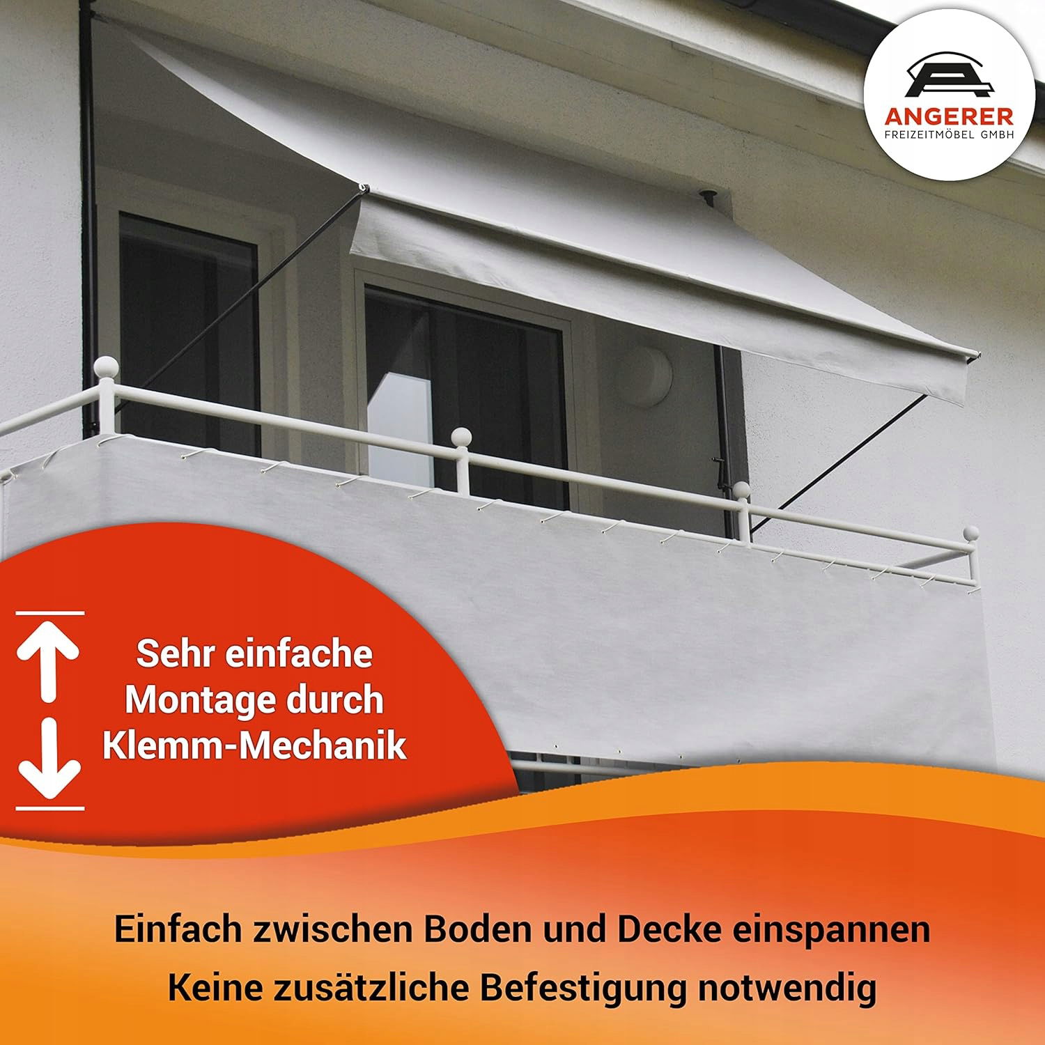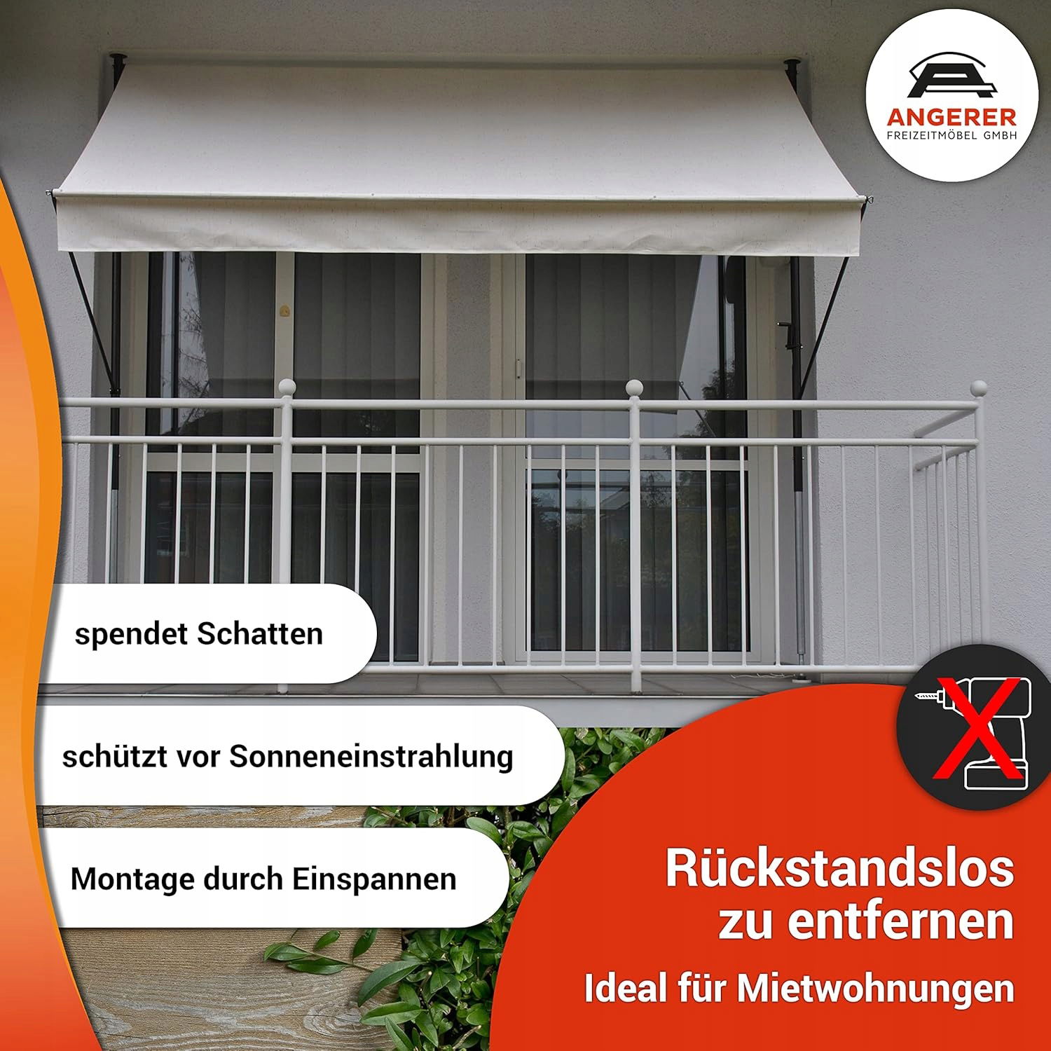 - Montaż bez wiercenia: montaż markizy na balkonie odbywa się poprzez zamocowanie i tym samym bez wiercenia i kołków. Nie pozostawia śladów i jest łatwa do usunięcia, dzięki czemu idealnie nadaje się do wynajmowanych mieszkań.