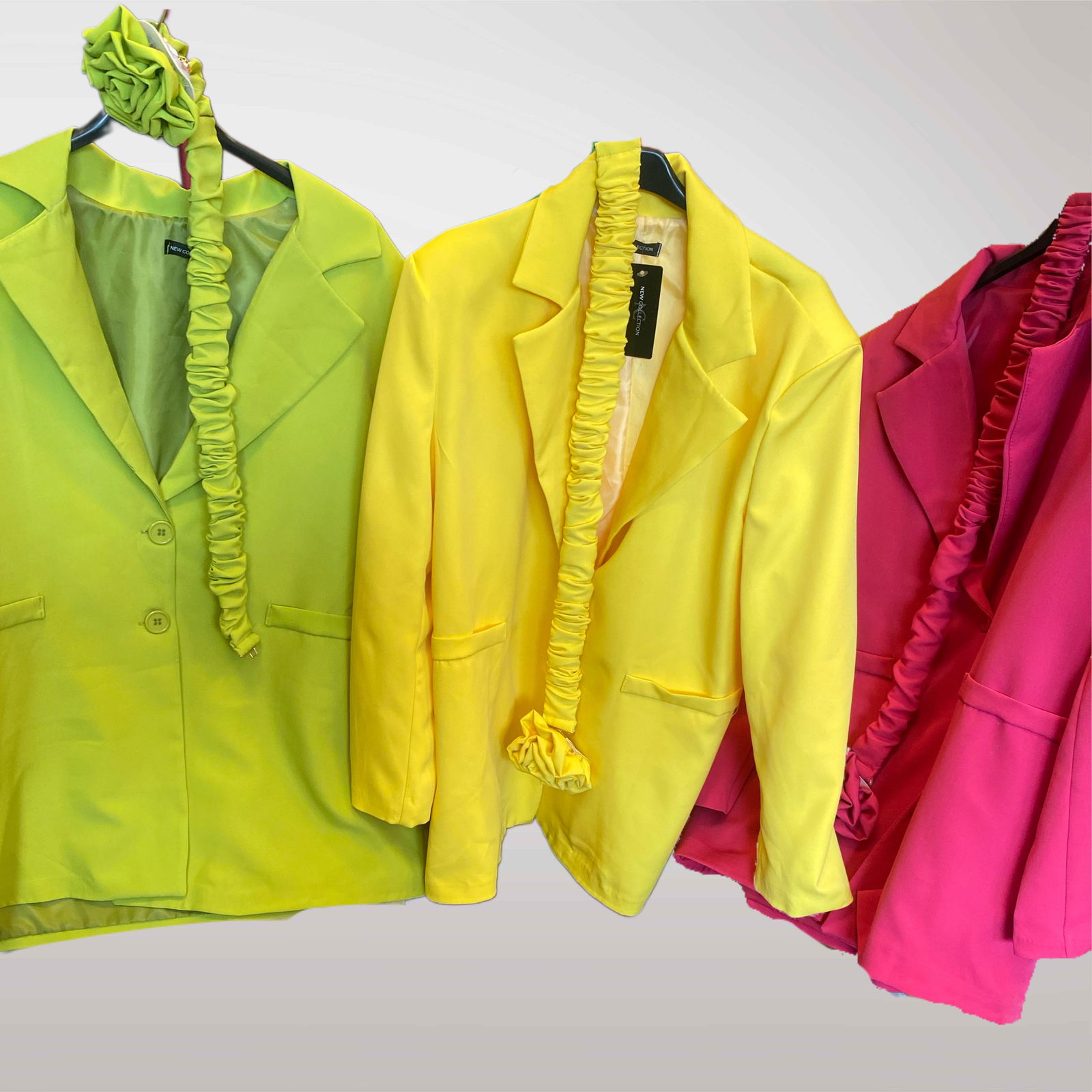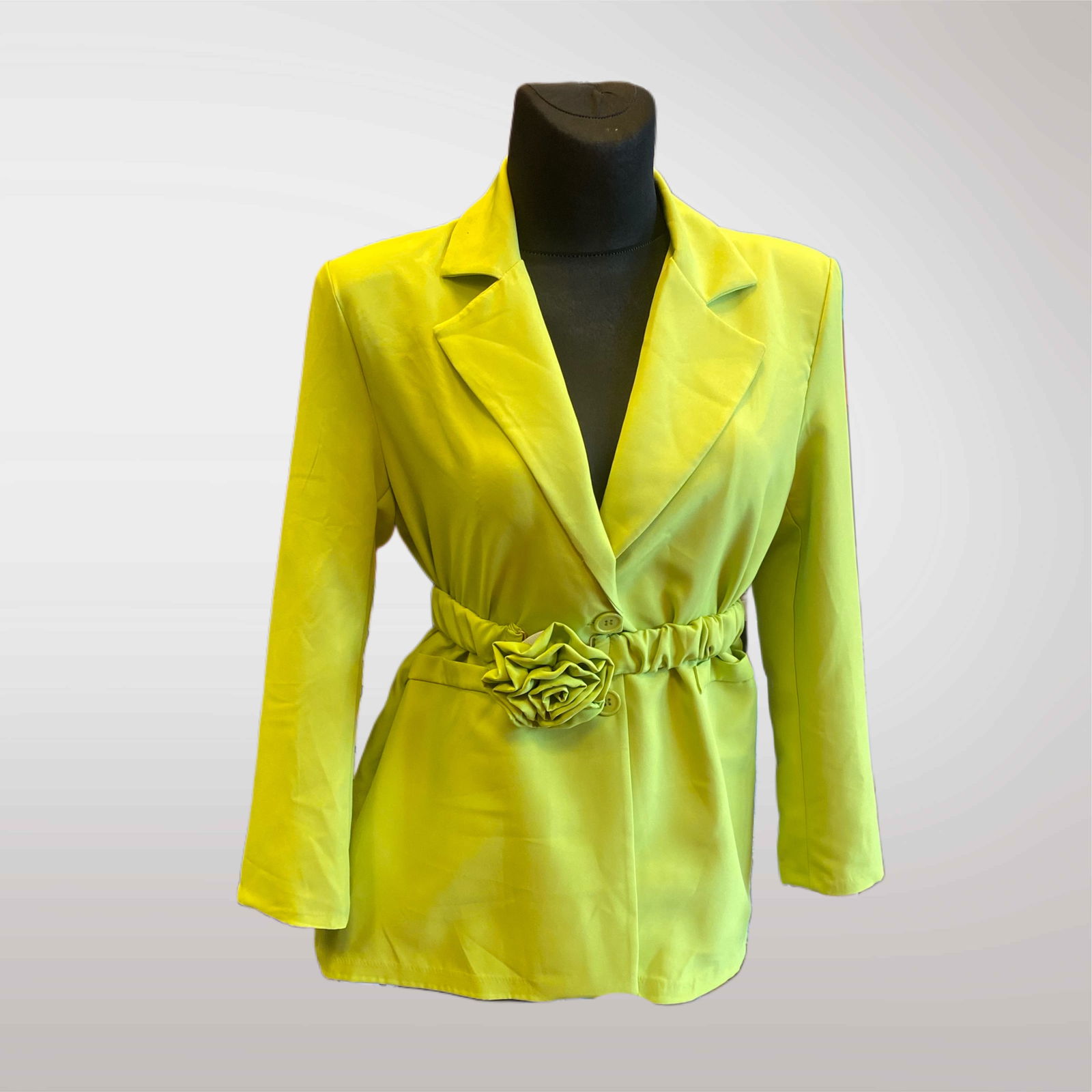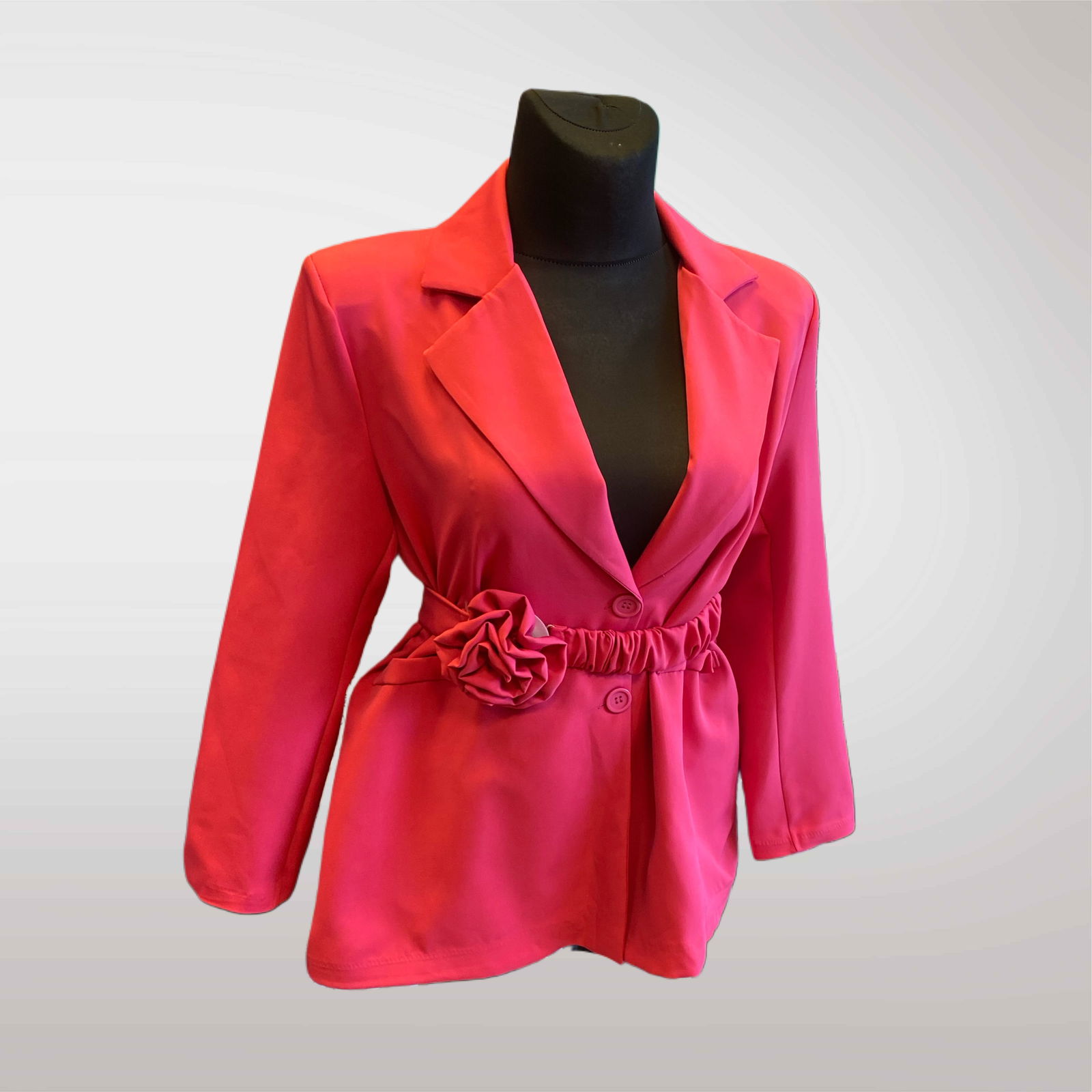 Kolorowa marynarka damska żakiet z ozdobnym paskiem – modny akcent w Twojej garderobie. Idealna na komunię, święta, wesele, rodzinne przyjęcia lub jako element codziennych stylizacji. Klasyczny krój z klapami i kieszeniami łączy się tu z wyrazistym kolorem i efektownym paskiem, który pięknie podkreśla talię lub może być noszony jako dodatek.