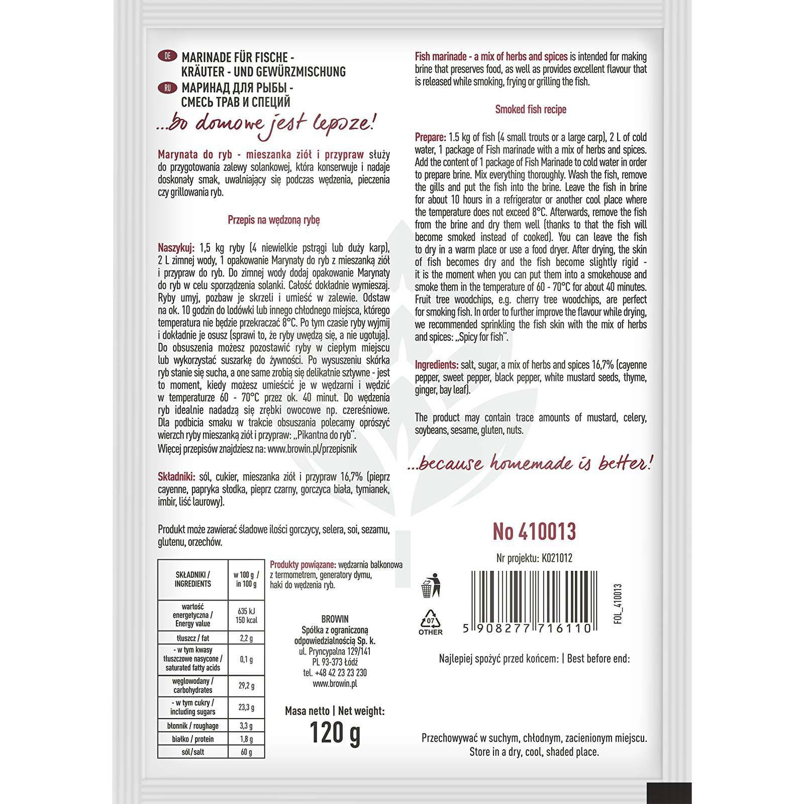 Marynata do ryb - mieszanka ziół i przypraw służy do przygotowania zalewy solankowej, która konserwuje i nadaje doskonały smak, uwalniający się podczas wędzenia, pieczenia czy grillowania ryb.