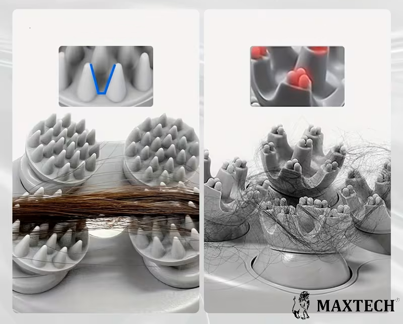 Nasz masażer MAXTECH®-608 posiada głowice w kształcie litery V, dzięki czemu delikatnie przesuwają się po włosach, nie wciągając ich do środka.