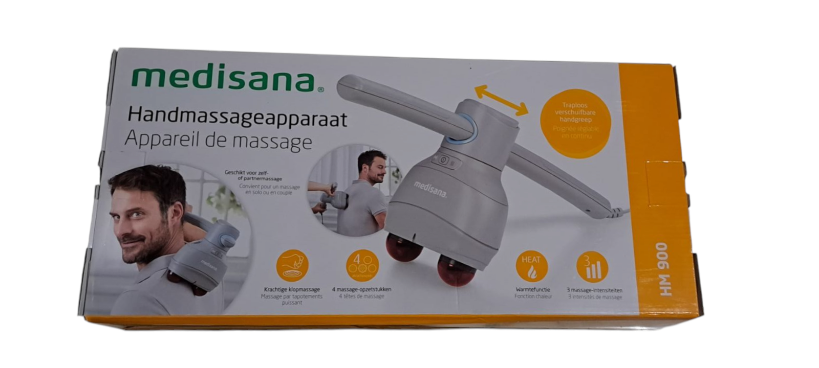 Masażer ręczny uderzeniowy z akupresurą Medisana HM 900 - Masaż ostukujący: Ręczny masażer HM 900 zapewnia intensywny i mocny masaż ostukujący, który skutecznie łagodzi napięcie mięśni i ból. - 4 nakładki: Masażer ręczny jest wyposażony w różne nakładki masujące. W zależności od rodzaju zastosowania możesz wybierać spośród 4 różnych głowic masujących - Elastyczne zastosowanie. Dzięki płynnie regulowanej rączce masażer ręczny można indywidualnie dopasować do różnych partii ciała. Można go stosować na różne sposoby, zarówno na szyję, ramiona, plecy, jak i nogi. - Przełączana funkcja grzania. Ogrzewanie można włączyć opcjonalnie. Energia ta rozchodzi się po głowicy masującej i przyczynia się do relaksującego efektu masażu. - Intensywność masażu. Dzięki masażerowi ręcznemu HM 900 możesz wybierać pomiędzy 3 intensywnościami masażu, zależnie od Twoich preferencji.