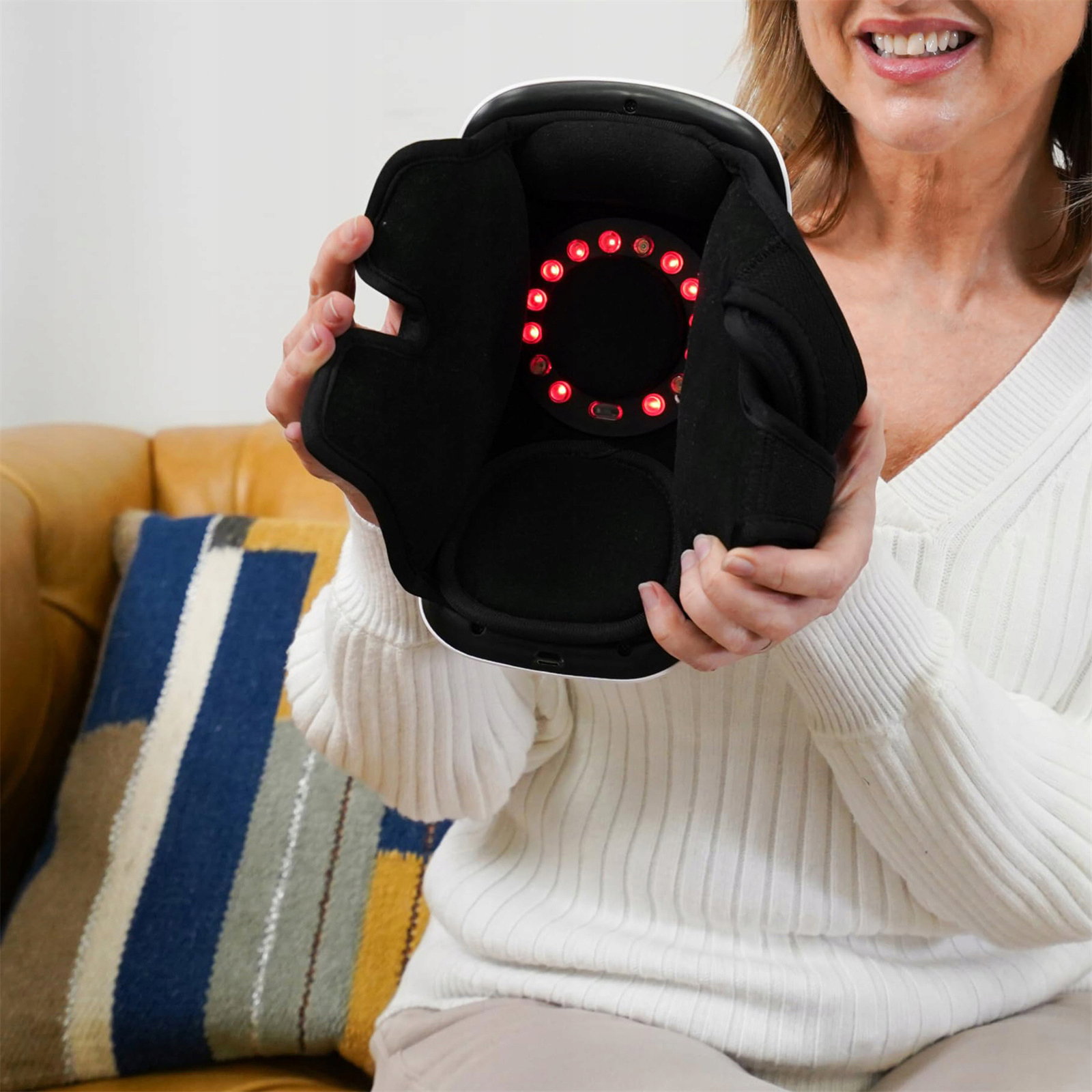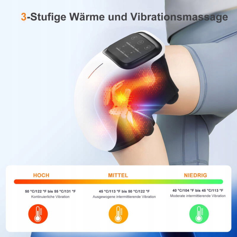 - Wszechstronny masażer kolan, aby złagodzić ból i dyskomfort oraz cieszyć się masażem po długim dniu. Ten masażer kolan ma 3 ustawienia wibracji, niskie, wysokie i program automatyczny. Trzy tryby ogrzewania, od niskiego ustawienia 40°C, przez średnie 50°C, aż po wysokie ustawienie ogrzewania do 60°C, a wszystko to z dodatkową zaletą przełączanego oświetlenia podczerwonego i laserowego.