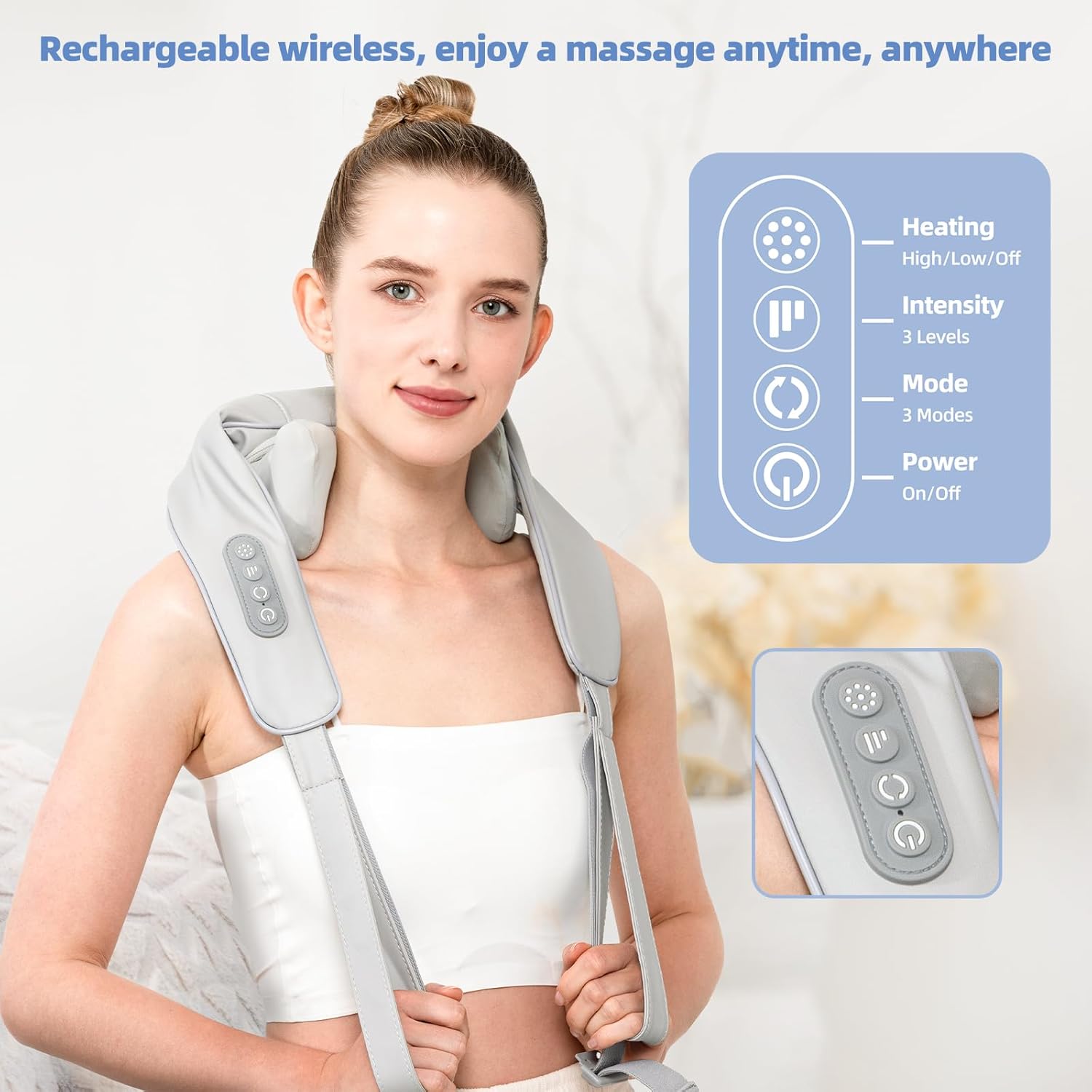 Masażer karku, bezprzewodowy masażer pleców z ogrzewaniem Shiatsu, elektryczny masażer z ładowaniem USB, z 2 trybami 3 intensywności, do domu i biura .