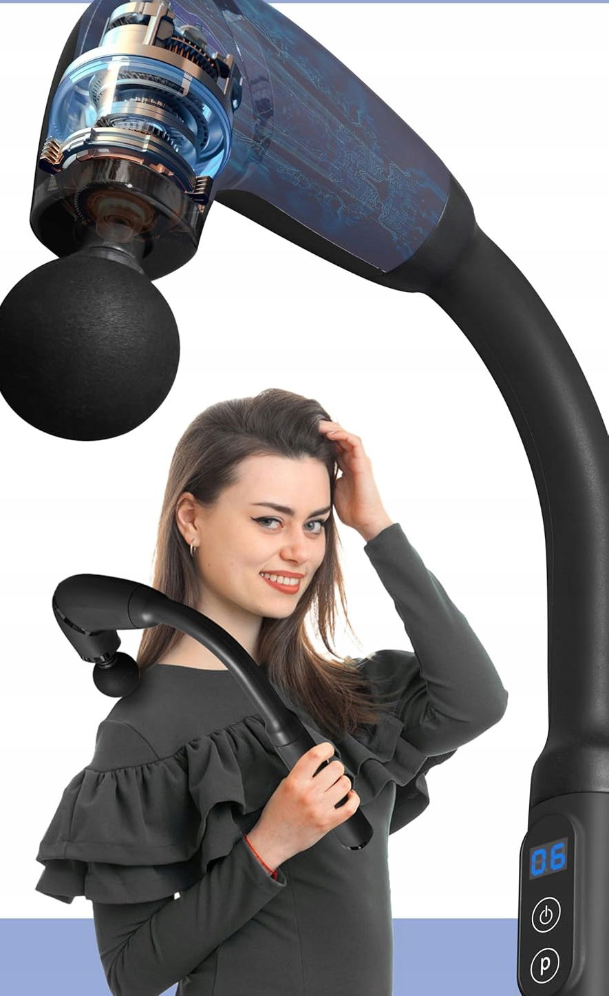 ✔ Typ: Masażer perkusyjny z uchwytem przedłużanym