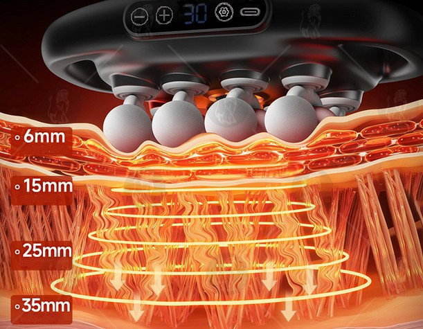 Technologia rozgrzewająco-wibracyjna przenika przez warstwy skóry i mięśni, docierając aż do 35 mm w głąb tkanek. Efekty?