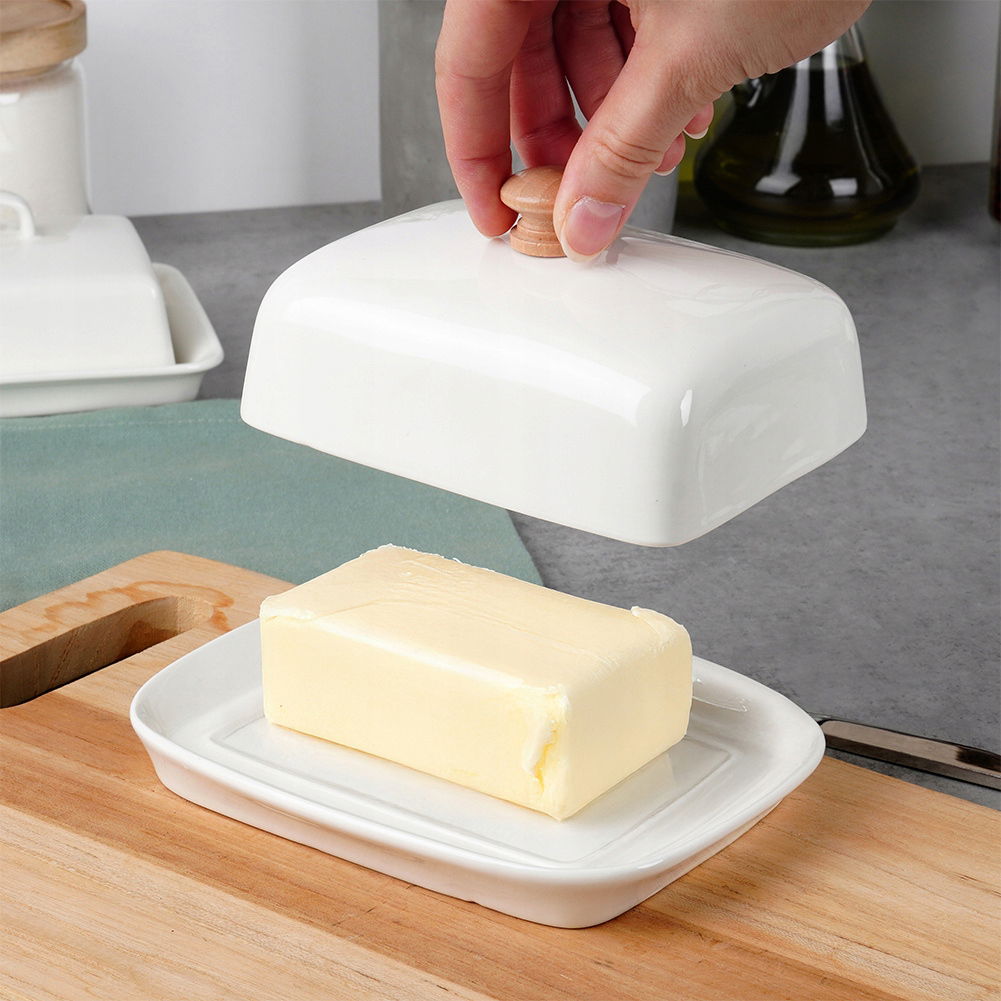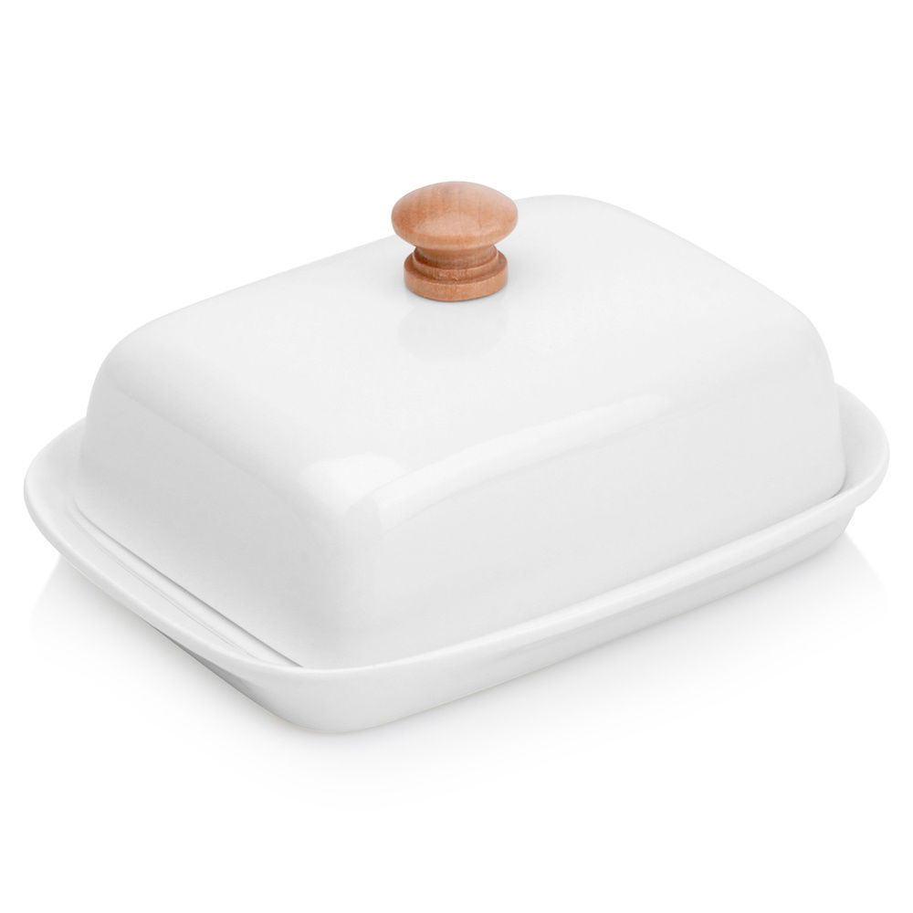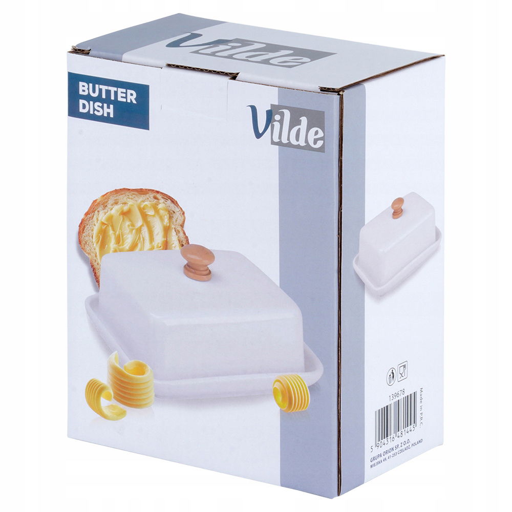Maselniczka do przechowywania i serwowania masła - Maselniczka do przechowywania masła w lodówce oraz jego serwowania. Maselniczka ma wymiary 16 x 12,5 x 7 cm. Wykonana z ceramiki w białym kolorze - Wykonana z najwyższej jakości ceramiki w białym kolorze. Uchwyt w pokrywie jest wykonany z drewna. Prezentuje się bardzo elegancko. Klasyczny kształt - Maselniczka posiada klasyczny kształt, więc będzie pasowała do wyposażenia każdej kuchni, a postawiona na stole pasuje do każdej zastawy. Utrzymana w modnym kolorze. Pokrywka utrzymująca świeżość masła - Maselniczka wyposażona w pokrywkę, która pomaga zachować świeżość i pełnię smaku masła, jednocześnie chroniąc je przed zepsuciem. Uchwyt w pokrywie zapewni wygodne korzystanie. Łatwe czyszczenie - Maselniczka jest łatwa w czyszczeniu, co sprawia, że utrzymanie jej w higienicznym stanie jest szybkie i bezproblemowe. Przydatna maselniczka, która sprawdzi się do przechowywania oraz serwowania masła. Posiada praktyczne przykrycie. Wykonana z materiałów bezpiecznych dla zdrowia i neutralnych dla żywności. Klasyczny wzór sprawi, że będzie pięknie prezentować się z każdą zastawą stołową. Przydatna w każdym domu. Oryginalny produkt marki Vilde. Wyprodukowano zgodnie z europejskimi standardami.