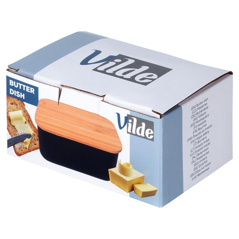 Maselniczka do przechowywania i serwowania masła - Maselniczka do przechowywania masła w lodówce oraz jego serwowania. Maselniczka ma wymiary 15 x 10 x 7,5 cm, wysokość maselniczki bez pokrywki wynosi 7 cm. Stalowa w kolorze czarnym z bambusową pokrywką - Wykonana z najwyższej jakości stali węglowej malowanej proszkowo na czarny kolor. Prezentuje się bardzo elegancko, dzięki bambusowej pokrywce. Klasyczny kształt - Maselniczka posiada klasyczny kształt, więc będzie pasowała do wyposażenia każdej kuchni, a postawiona na stole pasuje do każdej zastawy. Utrzymana w modnym kolorze. Zamykana pokrywka chroniąca świeżość - Wyposażona w pokrywkę, która umożliwia zamknięcie maselniczki. Pozwala zachować świeżość i zalety smakowe masła, a jednocześnie chroni je przed zepsuciem. Łatwe czyszczenie - Maselniczka jest łatwa w czyszczeniu, co sprawia, że utrzymanie jej w higienicznym stanie jest szybkie i bezproblemowe. Przydatna maselniczka, która sprawdzi się do przechowywania oraz serwowania masła. Posiada praktyczne przykrycie. Wykonana z materiałów bezpiecznych dla zdrowia i neutralnych dla żywności. Klasyczny wzór sprawi, że będzie pięknie prezentować się z każdą zastawą stołową. Przydatna w każdym domu. Oryginalny produkt marki Vilde. Wyprodukowano zgodnie z europejskimi standardami.