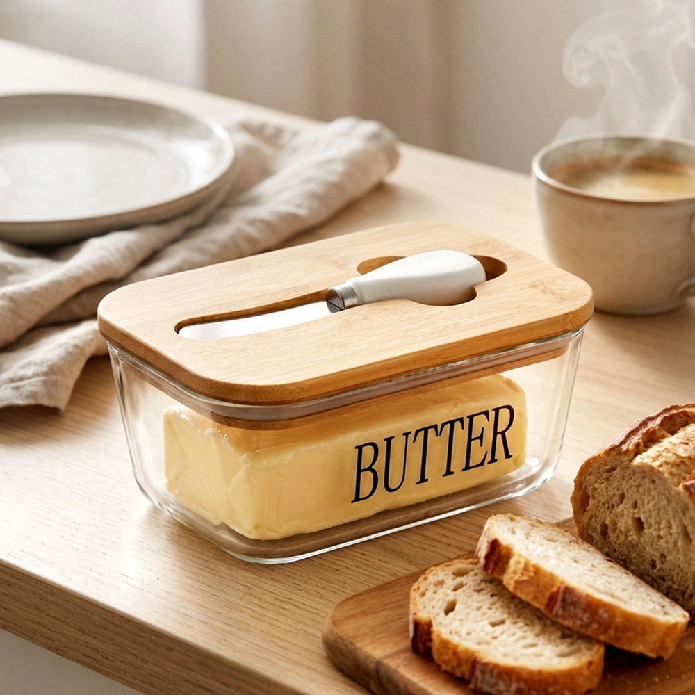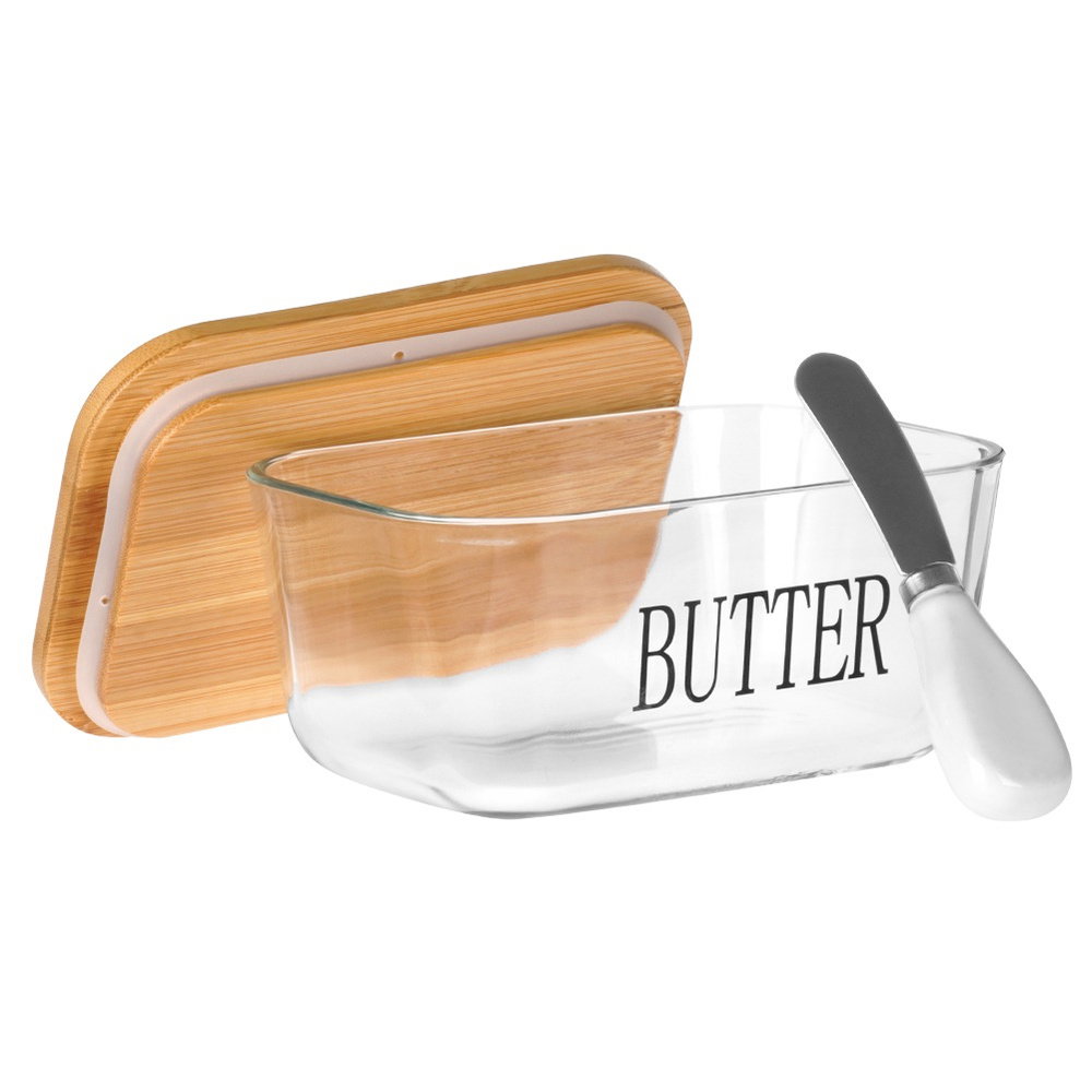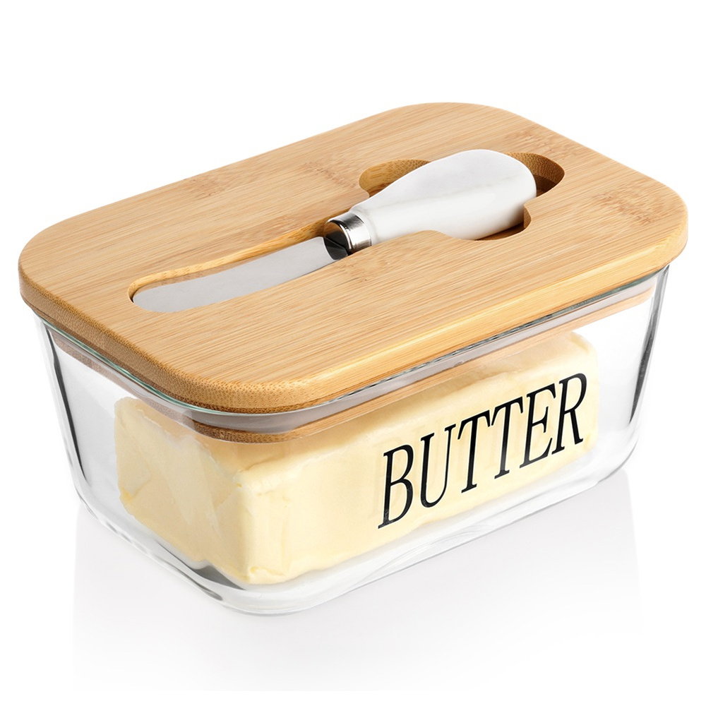 Maselniczka Szklana z Pokrywką Bambusowa Nożykiem Pojemnik na Masło