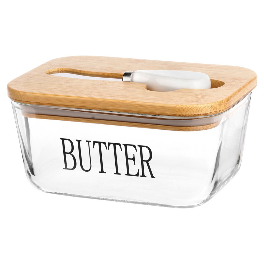 MODNY DESIGN - Wykonana z najwyższej jakości szkła w przezroczystym kolorze z czarnym napisem Butter. Prezentuje się bardzo elegancko, dzięki bambusowej pokrywce. Maselniczka posiada klasyczny kształt, więc będzie pasowała do wyposażenia każdej kuchni, a postawiona na stole pasuje do każdej zastawy. Utrzymana w modnym kolorze.
