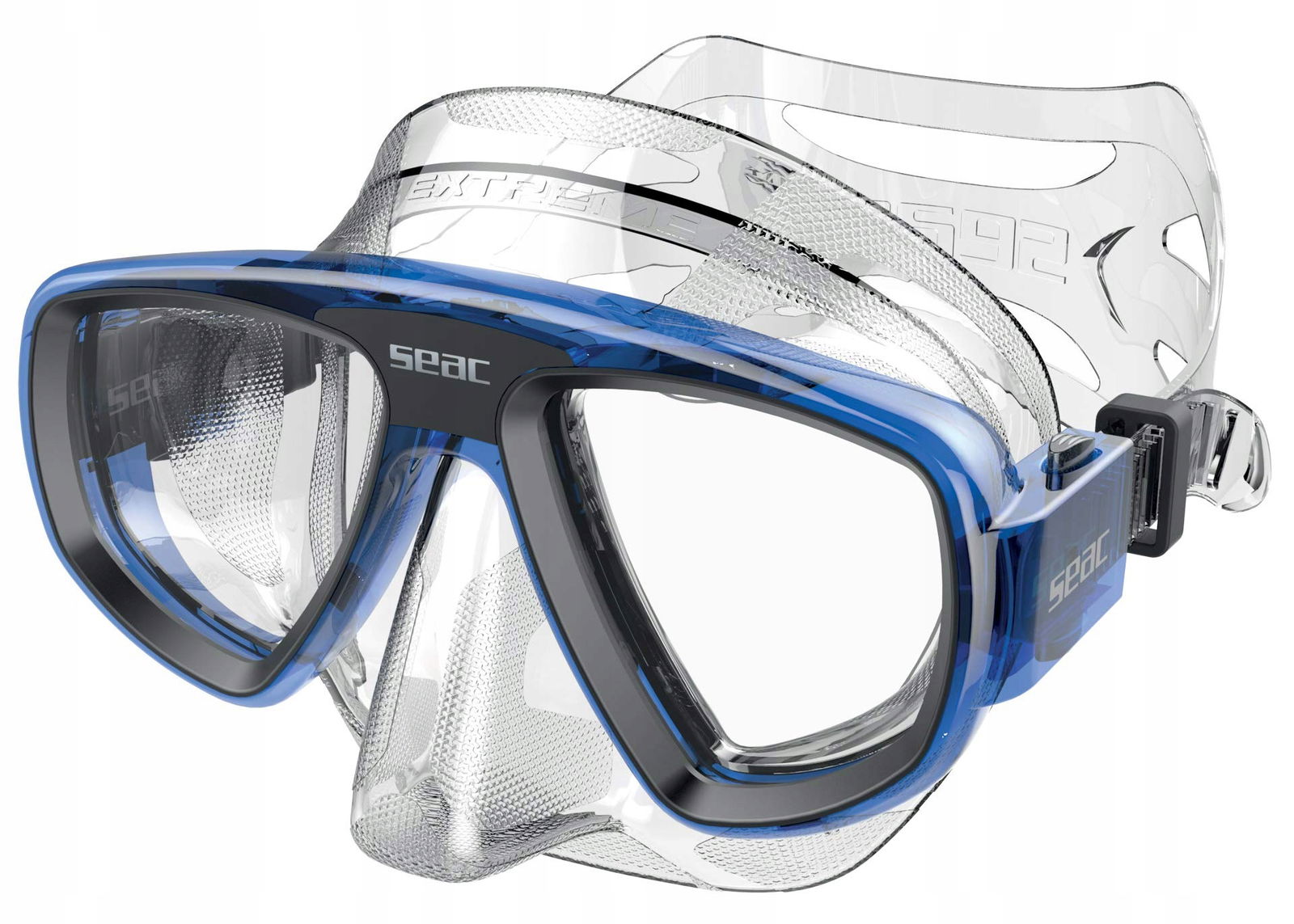 DUŻY KOMFORT - Maska do nurkowania Seac Extreme50 jest wyposażona w system Tubing Connected System, który obejmuje klamry zintegrowane z korpusem maski w celu zmniejszenia nacisku na twarz oraz duży silikonowy pasek z tyłu głowy, który utrzymuje maskę na miejscu