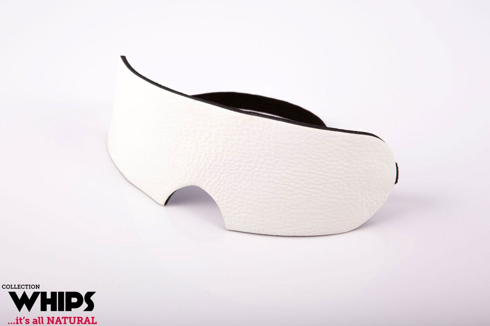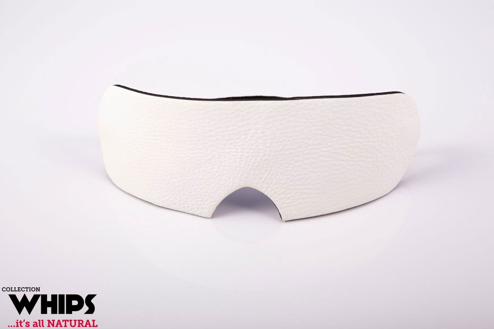 Skórzana biało-czarna opaska na oczy. Pakowana w eleganckie czarne tekturowe pudełko.