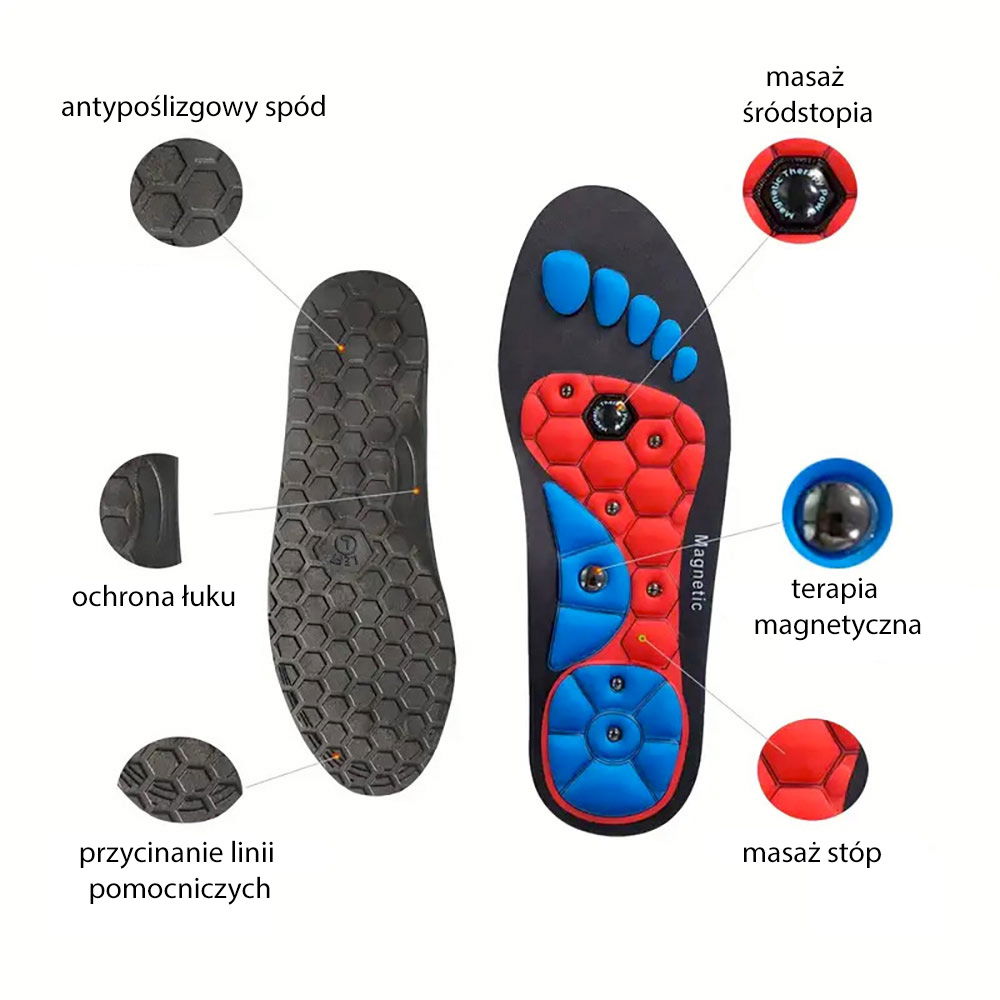 Dodatkowym atutem akupresurowych wkładek Magnetic są wbudowane punkty magnetyczne, które umieszczono w strategicznych miejscach pod stopą. Ich obecność wzmacnia efekt masażu i sprawia, że każdy krok staje się jeszcze bardziej relaksujący. To praktyczne rozwiązanie dla osób spędzających wiele godzin w pozycji stojącej lub aktywnie poruszających się w ciągu dnia.
