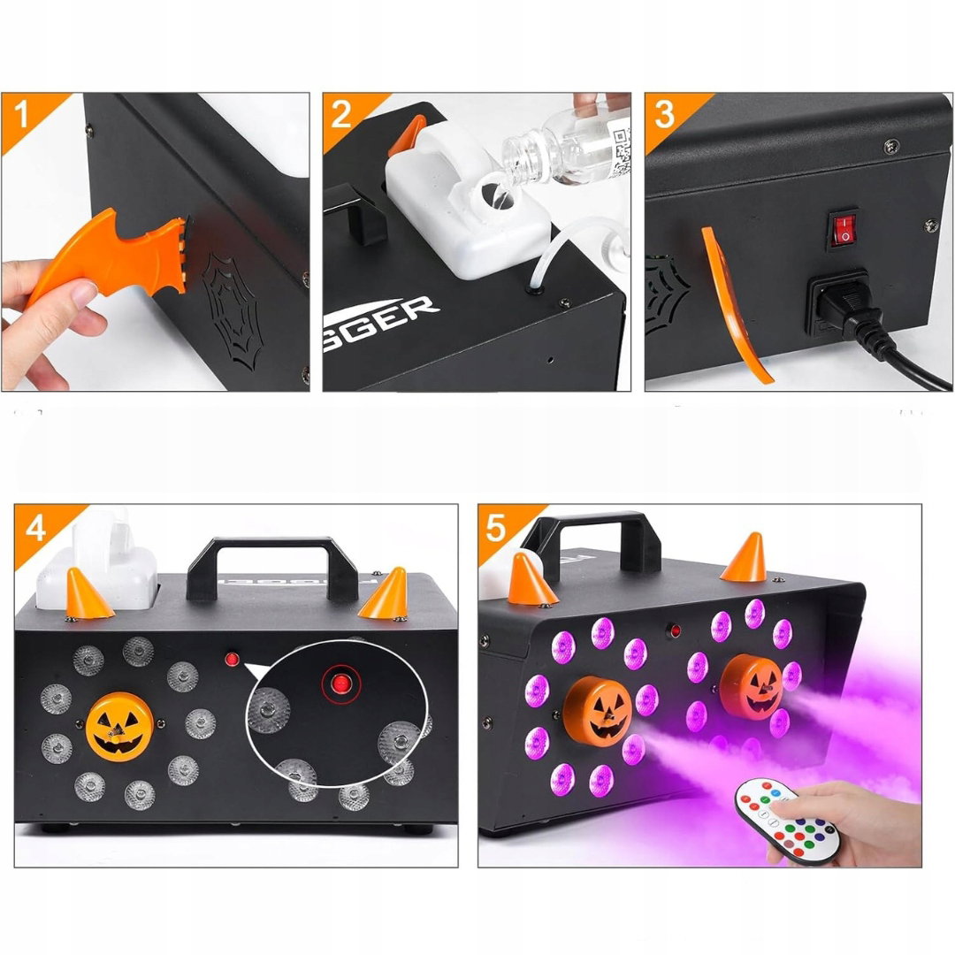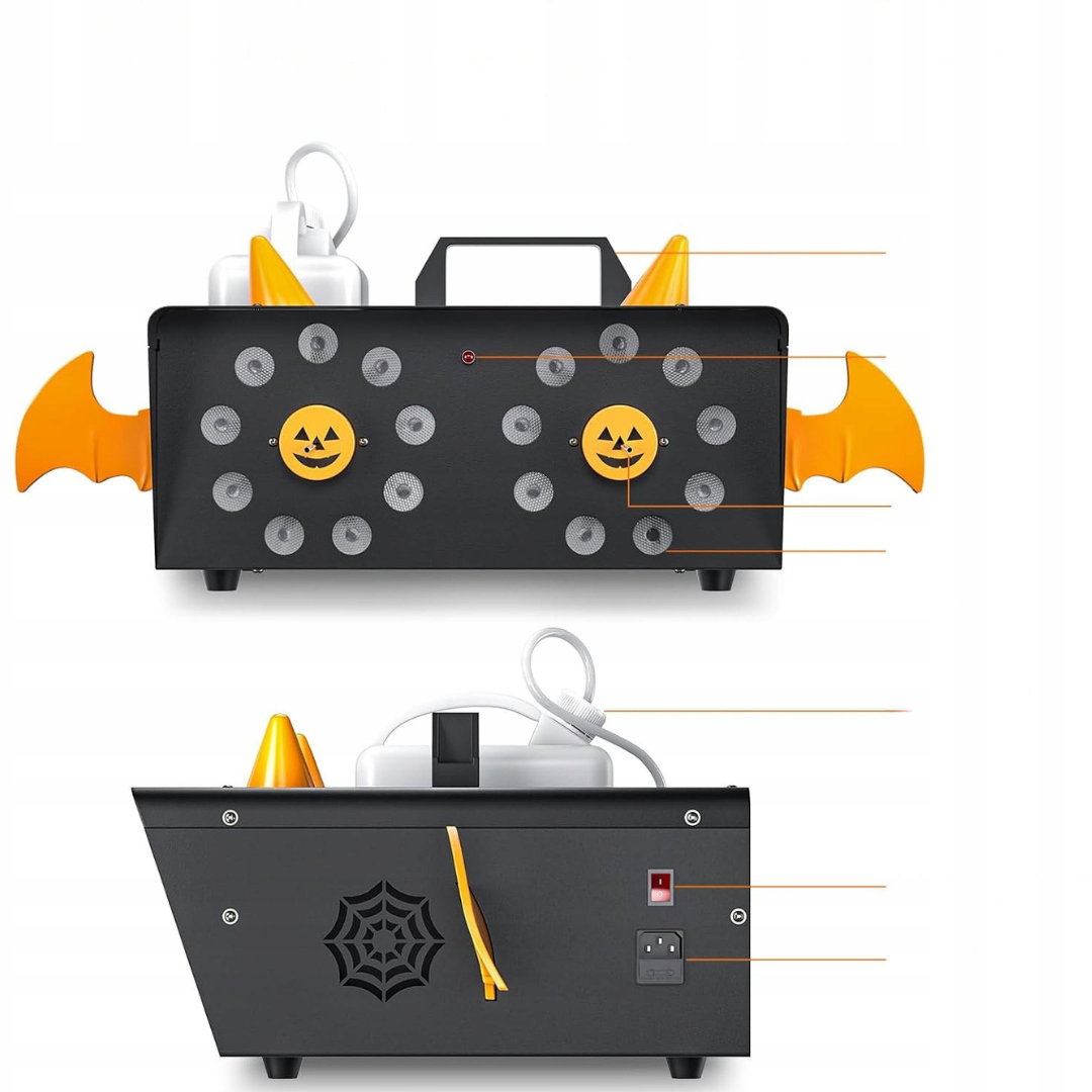 - Maszyna do wytwarzania dymu 1500 W: maszyna do dymu o mocy 1500 W charakteryzuje się wysoką wydajnością. Pomarańczowe kaptury i skrzydełka pełnią funkcję dekoracyjną i mogą zostać usunięte. Urządzenie może stać pionowo i wyrzucać dym w górę, tworząc efektowną atmosferę podczas imprezy.