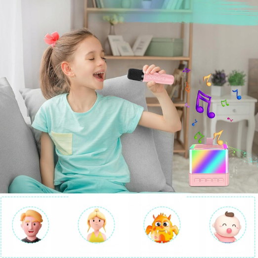 - Zastosowanie: zestaw służy do śpiewania karaoke, odtwarzania muzyki oraz organizowania zabawy z efektami świetlnymi i zmianą głosu. Umożliwia rozwijanie umiejętności wokalnych, budowanie pewności siebie oraz zapewnia rozrywkę podczas spotkań rodzinnych, przyjęć i zabaw dla dzieci i dorosłych.