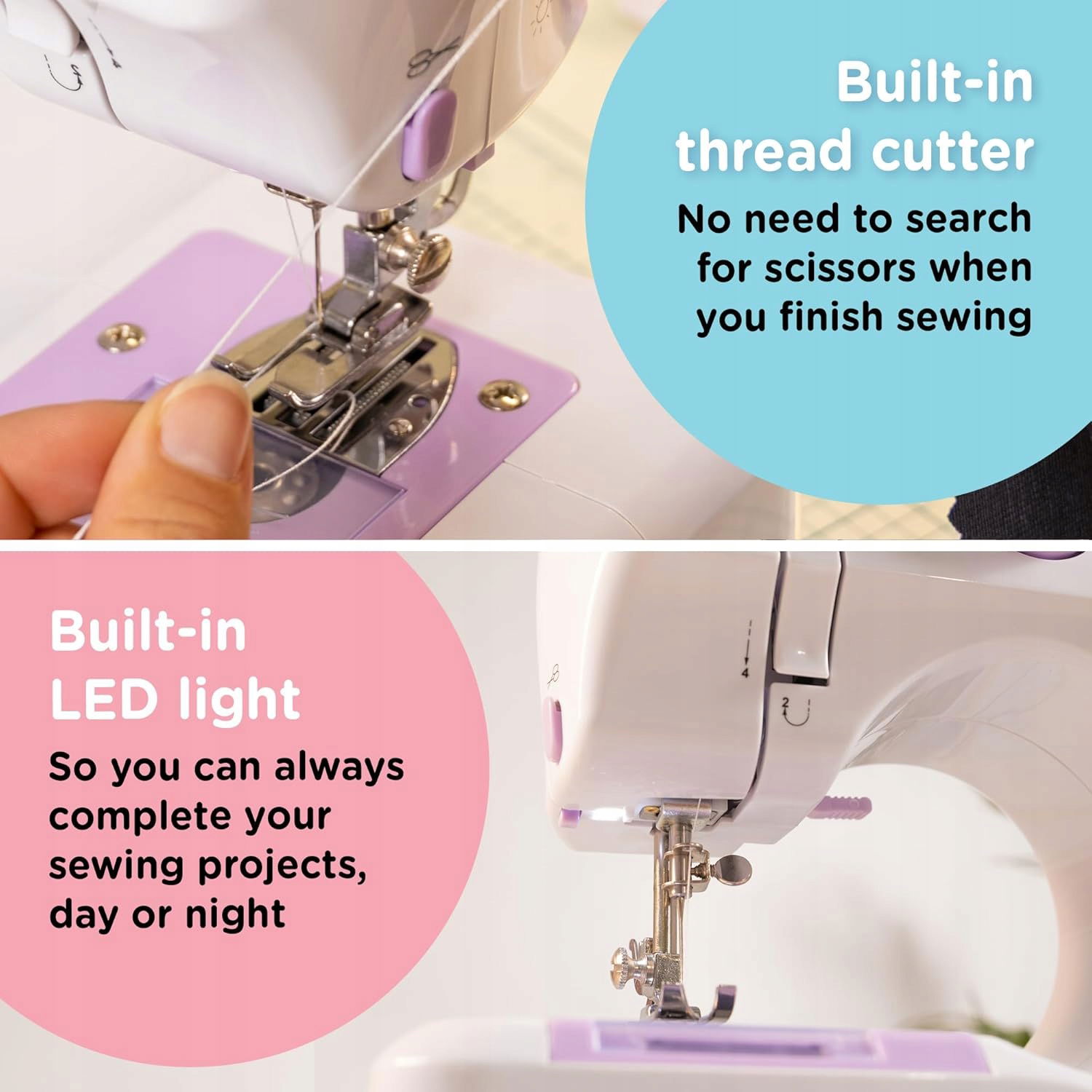 - Wbudowane światło LED – Oświetlenie LED pozwala na precyzyjne szycie nawet w słabym oświetleniu. Bez względu na porę dnia, zawsze zobaczysz każdy szczegół materiału.