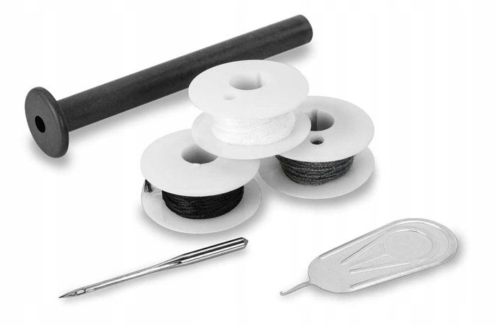 Zestaw zawiera: 1x maszynka do szycia, 3x szpulki z nićmi, 1x zapasowa igła, 1x trzpień do dużych szpul, 1x nawlekacz