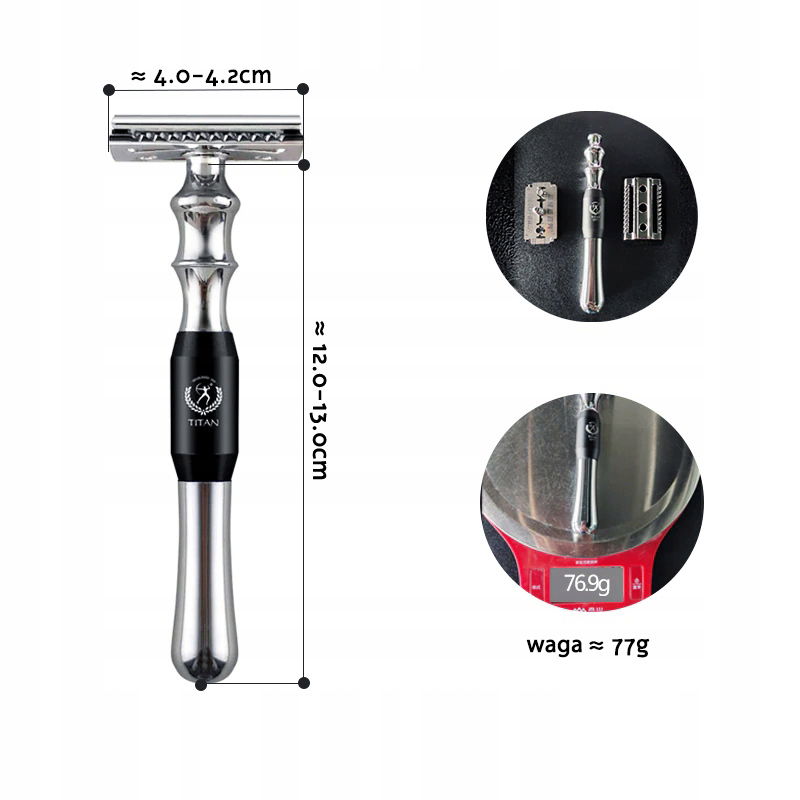 Klasyczna maszynka do golenia w kształcie litery T z zamkniętym grzebieniem. Ergonomiczny, doskonale dopasowany kształt uchwytu maszynki do golenia został zaprojektowany tak, aby perfekcyjnie zbalansować kontakt między dłonią a skórą twarzy. Uchwyt ze stali nierdzewnej z antypoślizgowym uchwytem, główka maszynki do golenia ma polerowane lustrzane wykończenie.