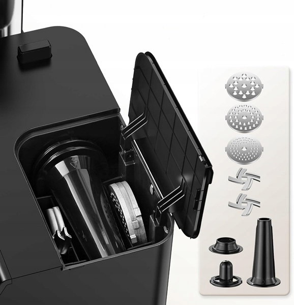 - Ta domowa maszynka do mięsa jest wyposażona we wbudowaną przestrzeń do przechowywania, w której wszystkie nasadki, w tym 2 ostrza, 3 płytki mielące oraz nasadkę do kiełbas i krokietów, można utrzymać w porządku.