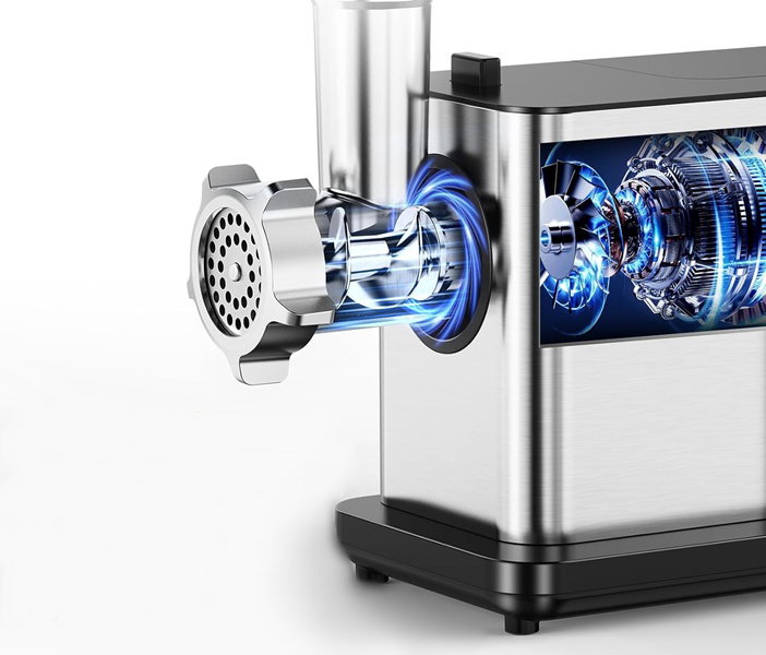 - Nasza maszynka do mięsa posiada inteligentną funkcję automatycznego cofania, która automatycznie usuwa blokady, zapewniając płynne i nieprzerwane mielenie za każdym razem.