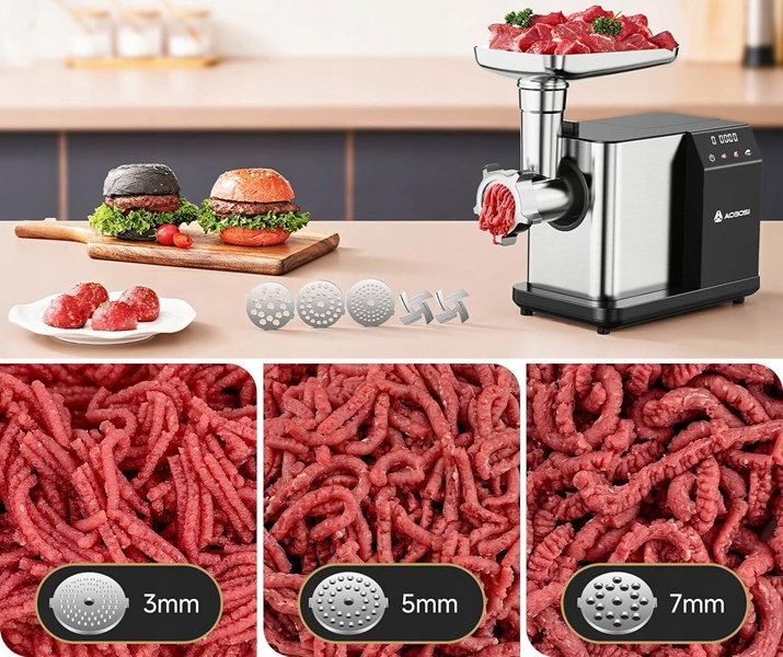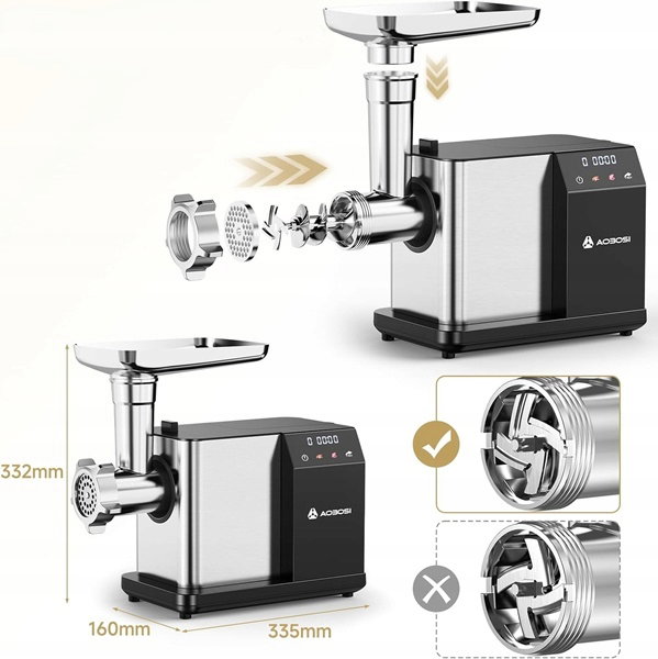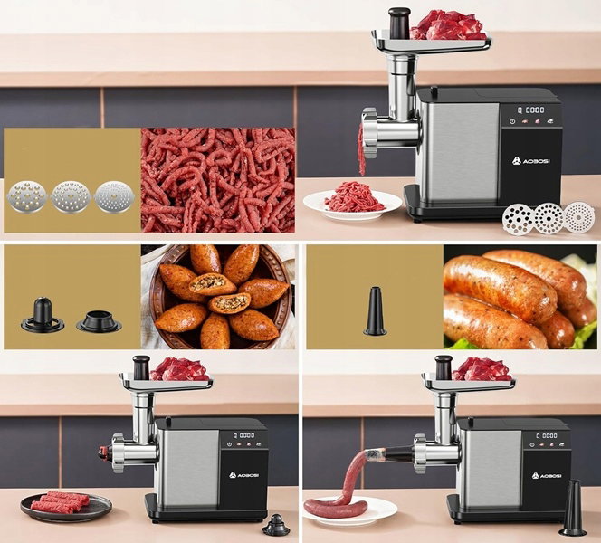 - Maszynka do mielenia mięsa AOBOSI jest wyposażona w 2 ostrza tnące, 3 talerze szlifierskie, 1 zestawy do kiełbasy, 2 nasadki kibbe i 1 popychacz do żywności, aby spełnić różne potrzeby w zakresie przetwarzania składników.