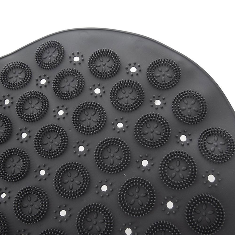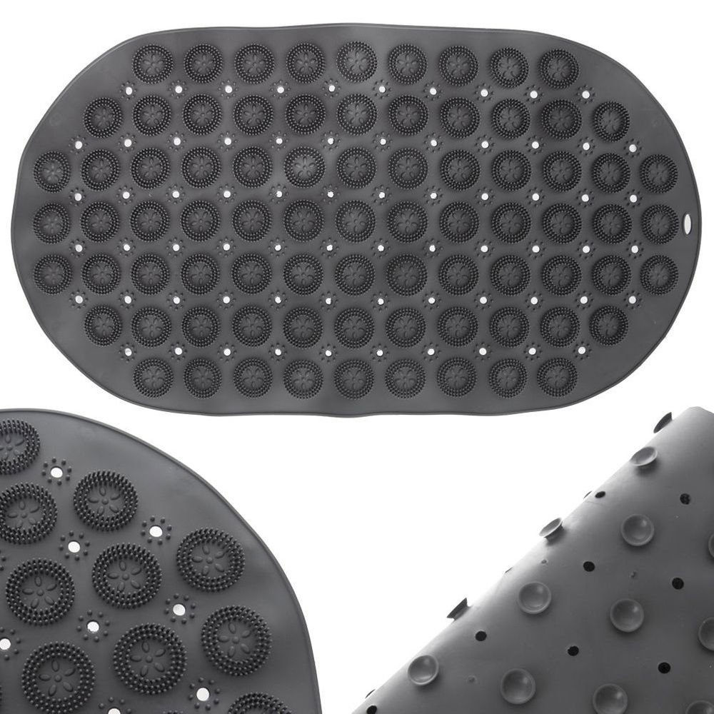 ANTYPOŚLIZGOWA - Łazienkowa mata antypoślizgowa z wypustkami masującymi. Mata ma owalny kształt o wymiarach 68 x 37 cm. Sprawdzi się pod prysznicem, w brodziku lub wannie. Mocno przylega za pomocą przyssawek.