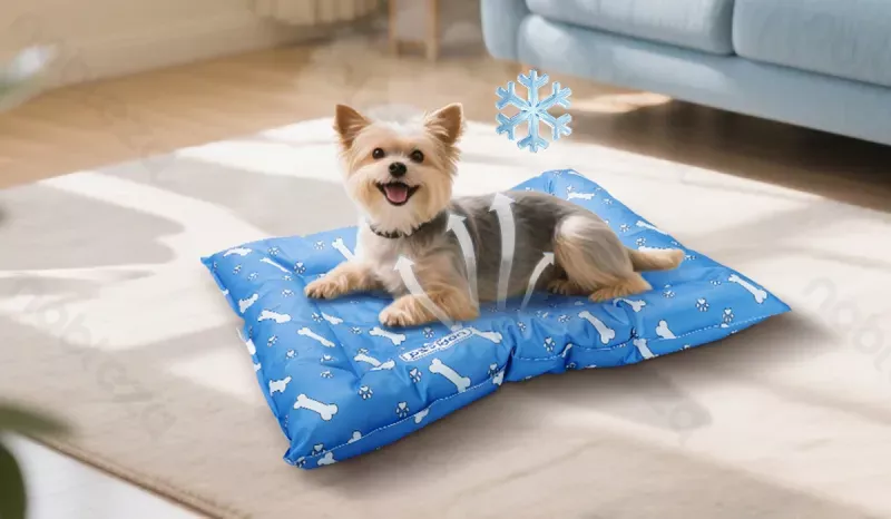 Prostokątna mata chłodząca dla zwierząt z chłodzącym żelem i wygodnym wykończeniem. Idealna dla psa, zapewnia komfort w upalne dni bez potrzeby chłodzenia w lodówce .