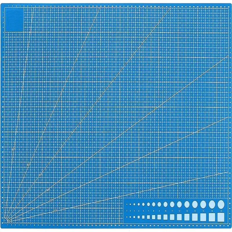 Po obu stronach ma warstwę, na której została nadrukowana podziałka centymetrowa w pionie i poziome, są zaznaczone kąty, kątomierze, linie równoległe, oraz figury.