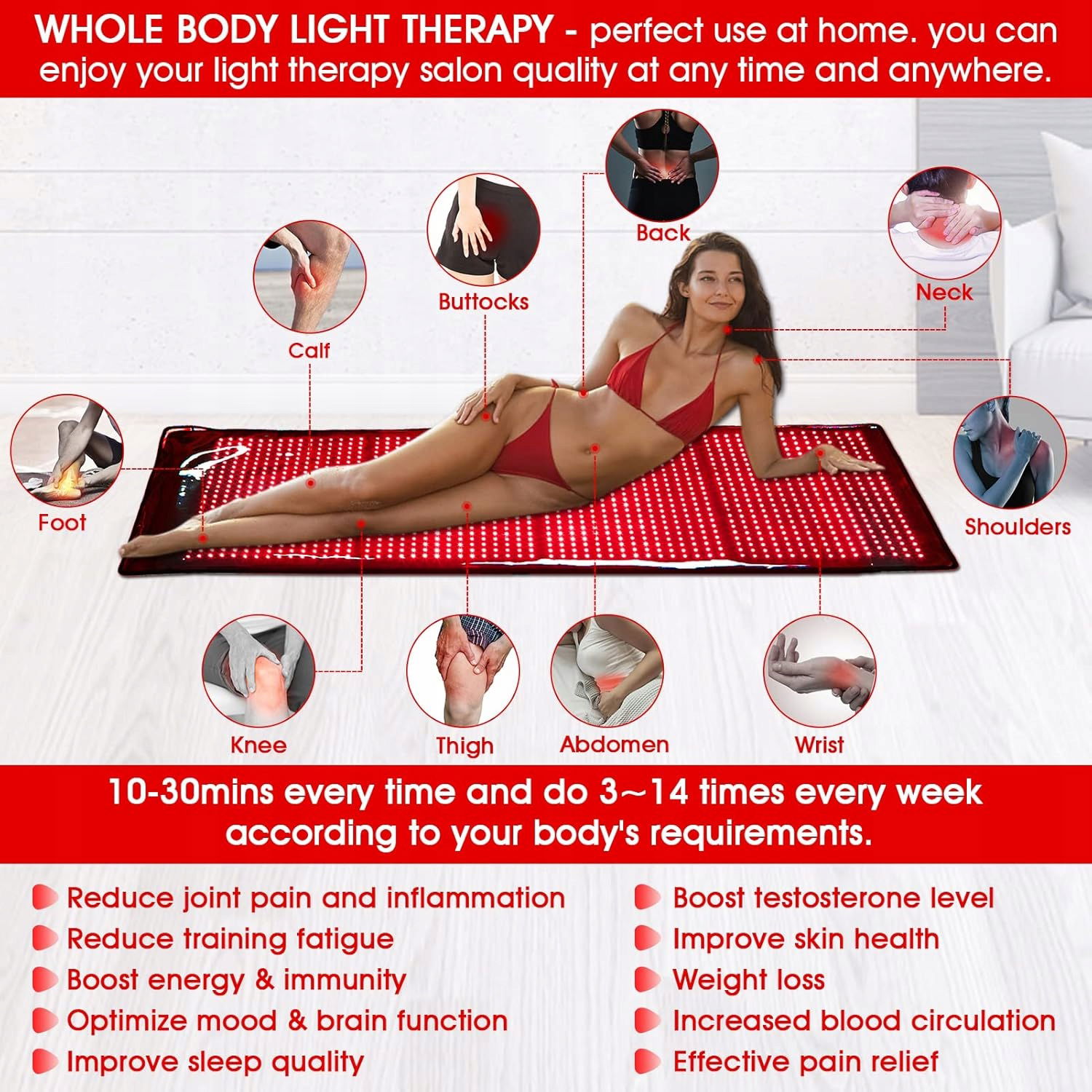 - Duży rozmiar 170 x 60 cm: to czerwone światło LED o bardzo dużym rozmiarze, nowa szeroka konstrukcja sprawia, że nadaje się dla większości osób. Każdy płaski i twardy obszar może być miejscem do relaksu. Wystarczy położyć się na podkładce do terapii podczerwieni. Za każdym razem nie dłużej niż 30 minut i 1-2 razy dziennie. Przed kolejną terapią należy nawodnić i schłodzić ciało, odpocząć, aby osiągnąć lepszy relaks.