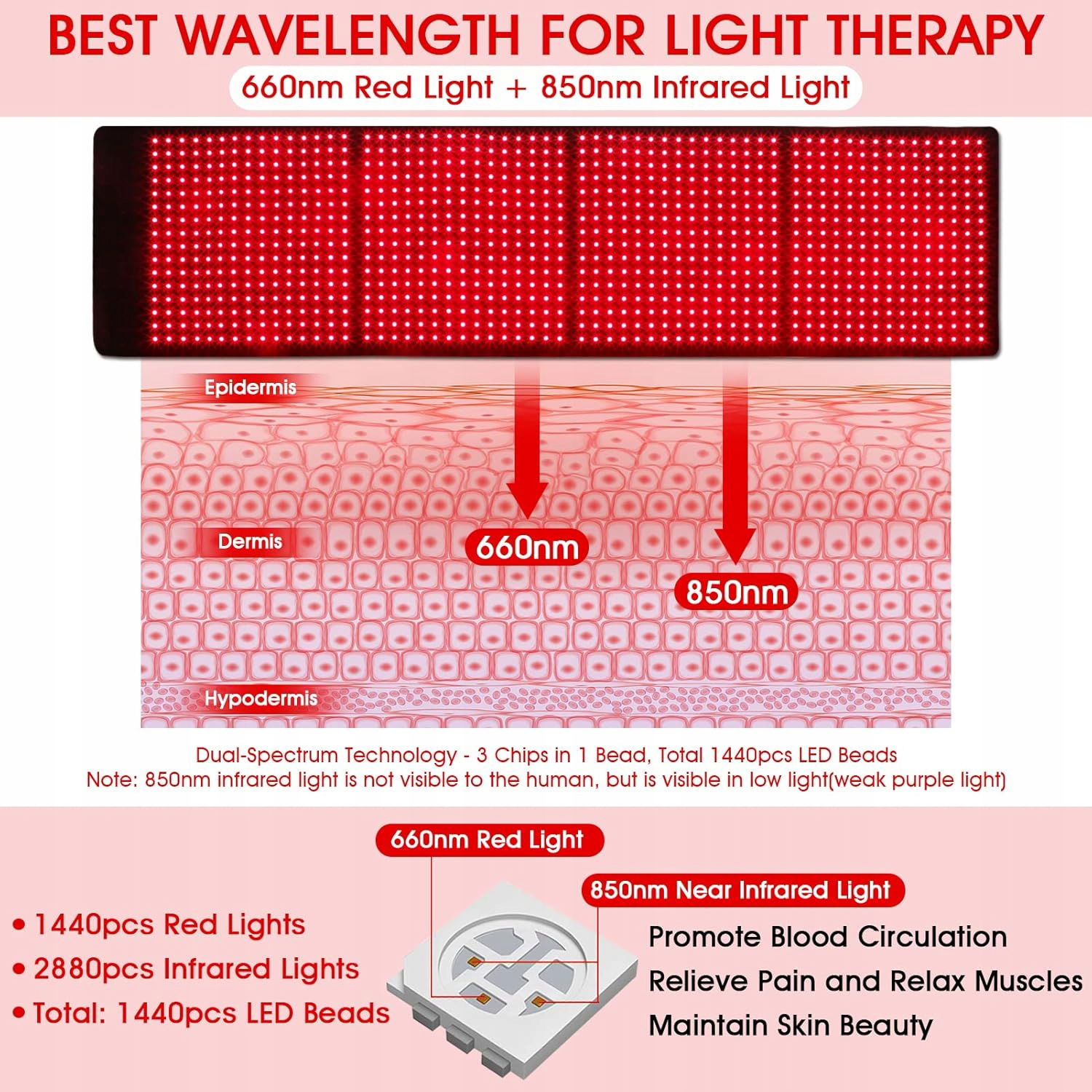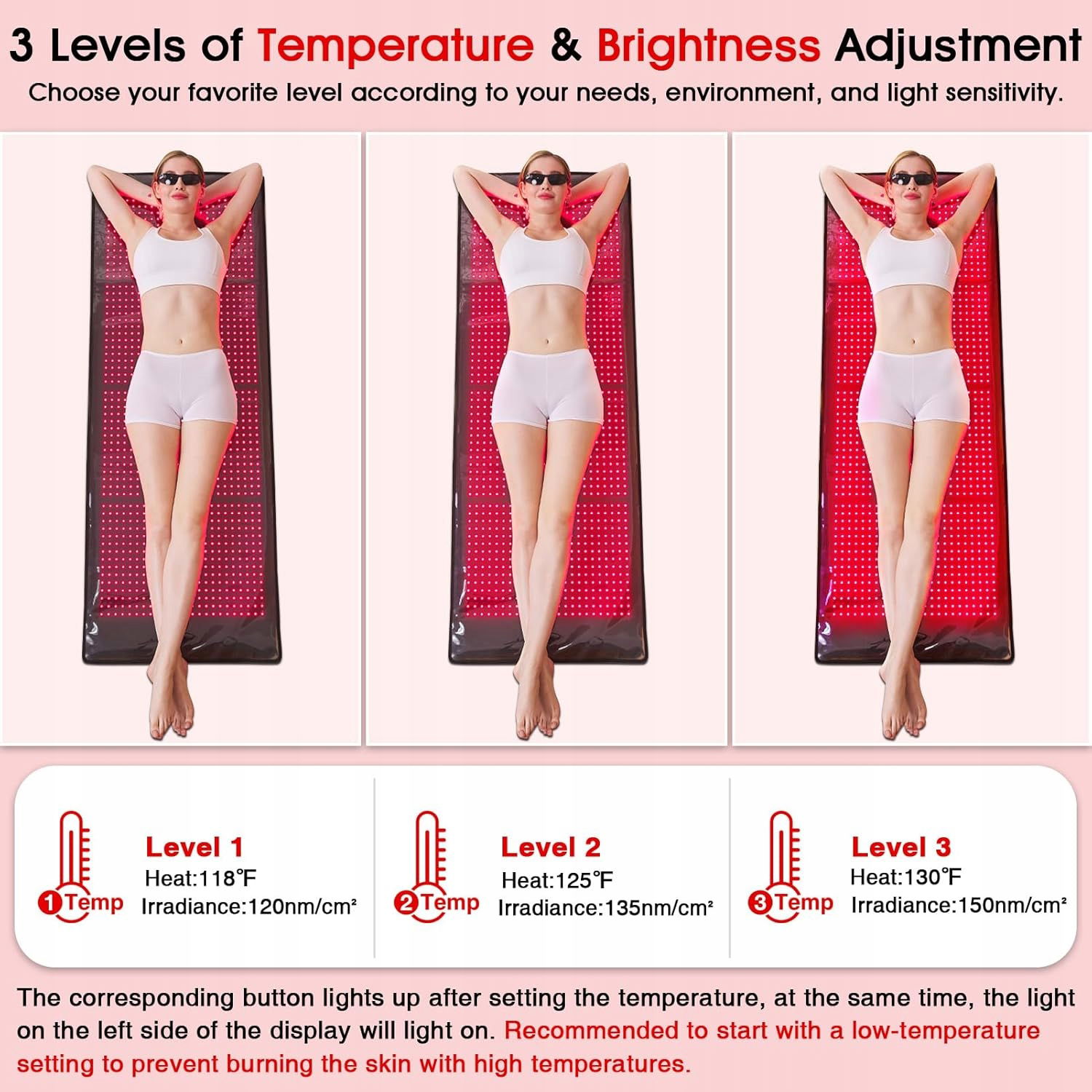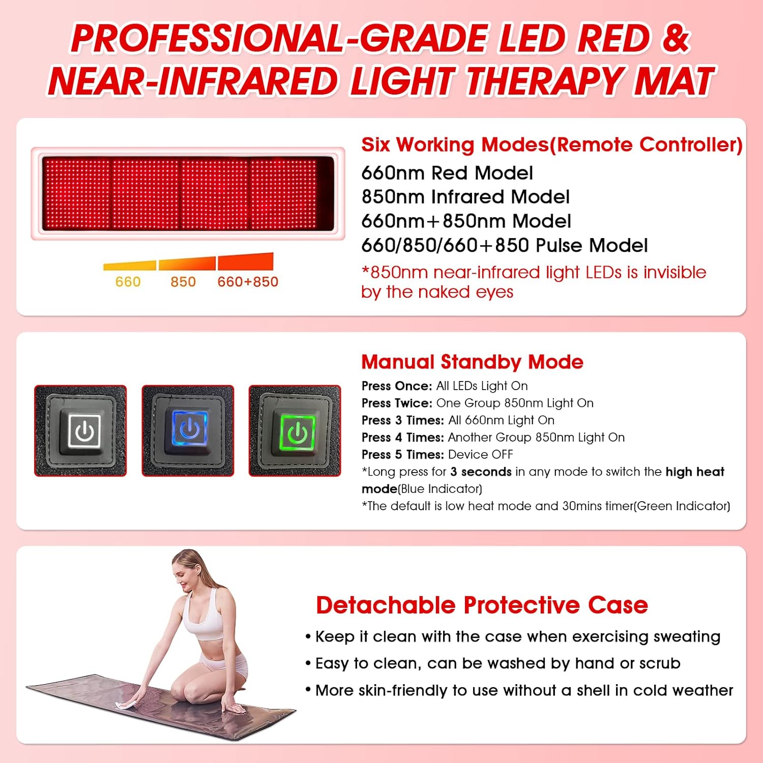 - 850 NM NEAR INFRARED BEZPIECZNY KONTROLA: Każda dioda LED zawiera 2 diody LED w bliskiej podczerwieni i 2 przyciski do sterowania każdą bliską podczerwienią. Jednocześnie czerwone światło 660 nm i 850 światła bliskiego podczerwieni mogą być również sterowane oddzielnie. Można ustawić tryb świecenia zgodnie z własnymi potrzebami. Zalecamy włączenie wszystkich czerwonych i podczerwonych świateł dla lepszego działania.