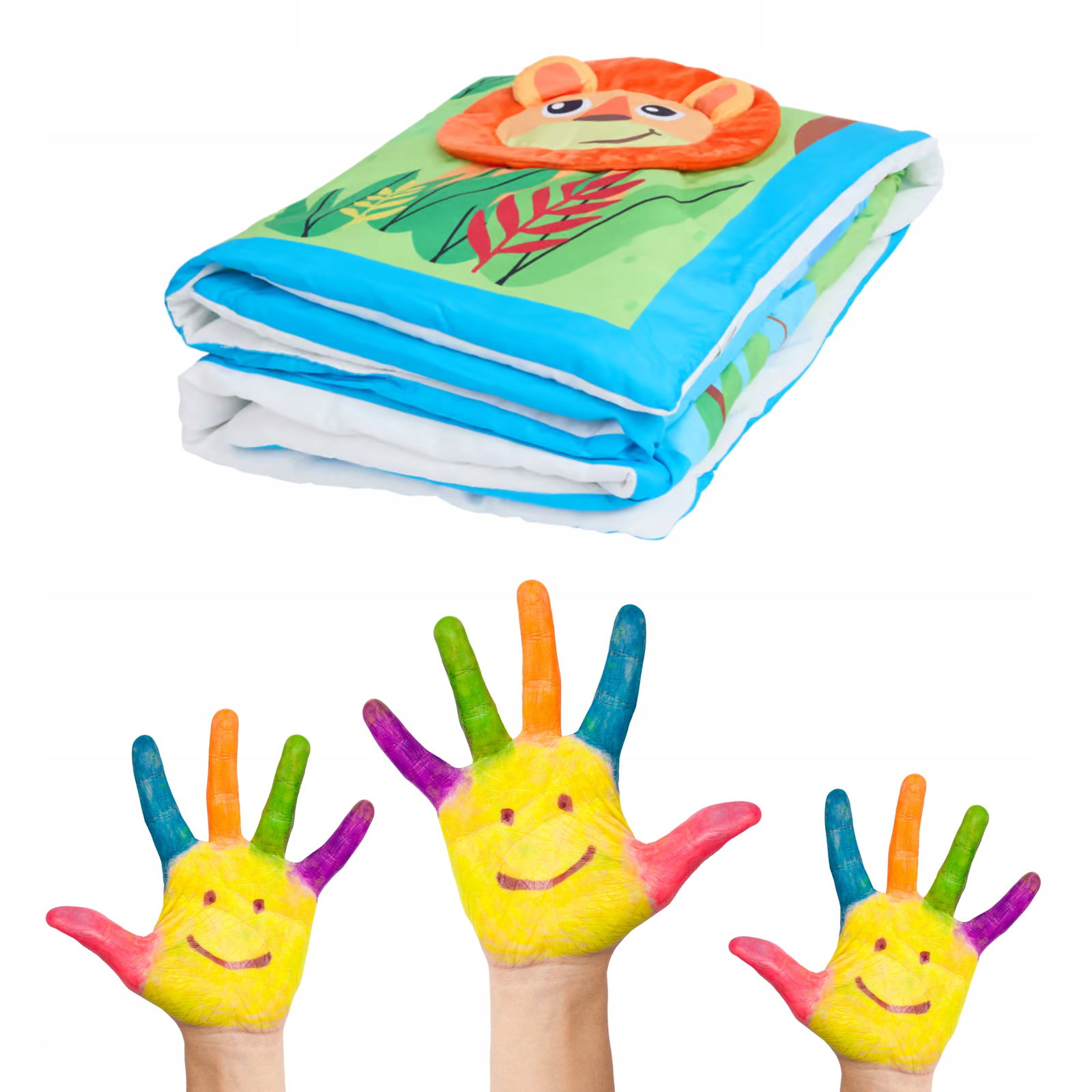 Nasza mata do zabawy dla niemowląt z kolorowymi ilustracjami doskonale stymuluje rozwój malucha już od najmłodszych miesięcy.