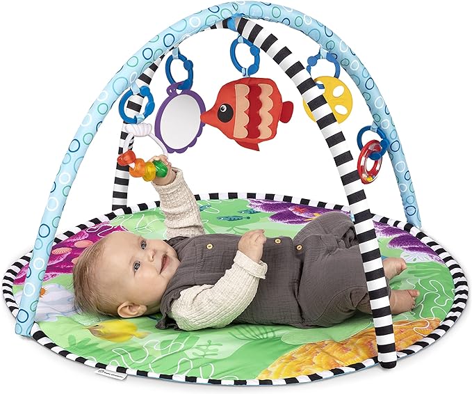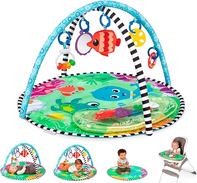 Rozwój sensoryczny z odrobiną zabawy! Dzięki siłowni do zabawy Sea Floor Explorers 2 w 1 z matą wodną pobudzasz zmysły swojego dziecka i pobudzasz ciekawość i eksplorację. Dzięki 4 trybom idealnym do leżenia na brzuszku, leżenia i zabawy, zajęć siedzących, a nawet czasu na krzesełko do karmienia, siłownia wyposażona jest w 5 zabawek sensorycznych, wygodną powierzchnię do zabawy i unikalną matę wodną, która umożliwia przenośną, pozbawioną bałaganu zabawę w wodzie. Jedyna w swoim rodzaju mata wodna jest zdejmowana, aby umożliwić wodne przygody na podłodze lub krzesełku do karmienia. Odpinane zabawki sprzyjają zabawie sensorycznej i odkrywaniu dzięki dzwonkom, lusterku bezpiecznemu dla dziecka, zabawce sensorycznej i nie tylko. Miękka, wygodna mata do zabawy ma żywe kolory i kontrastowe wzory do stymulacji wizualnej. Opus Ośmiornica i Żółw Neptun z edukacyjnej rozrywki Baby Einstein witają dziecko do zabawy. Siłownia czyści do czysta.