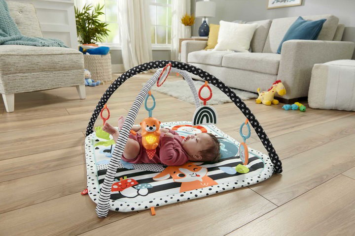 - Zabawki zachęcają do chwytania, sięgania i poruszania się – idealne podczas zabawy na brzuszku.