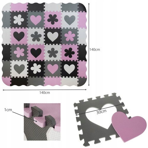 - SPECYFIKACJA – etui: tak, wyjmowane środki: tak; możliwość budowania 3D: tak; możliwość zrobienia kojca: tak; antypoślizgowe: tak; wodoodporne: tak; liczba puzzli: 36; liczba wszystkich elementów: 50; grubość: 1cm; wymiary złożonej maty: 112/112cm; wymiary jednego puzzla: 30x30x1cm; waga: 1,55kg
