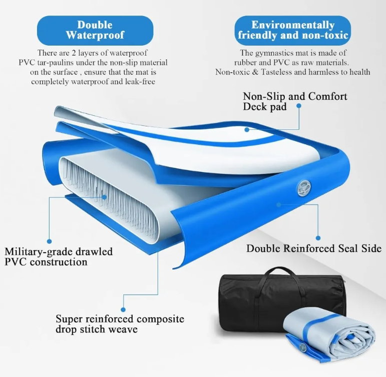 Mata gimnastyczna PPXIA wykonana jest z wysokiej jakości materiału PVC o zwiększonej gęstości, odpornego na odkształcenia i uszkodzenia. Dzięki solidnej strukturze „Drop Stitch” zachowuje stabilność nawet pod dużym naciskiem, minimalizując ryzyko kontuzji podczas treningu.