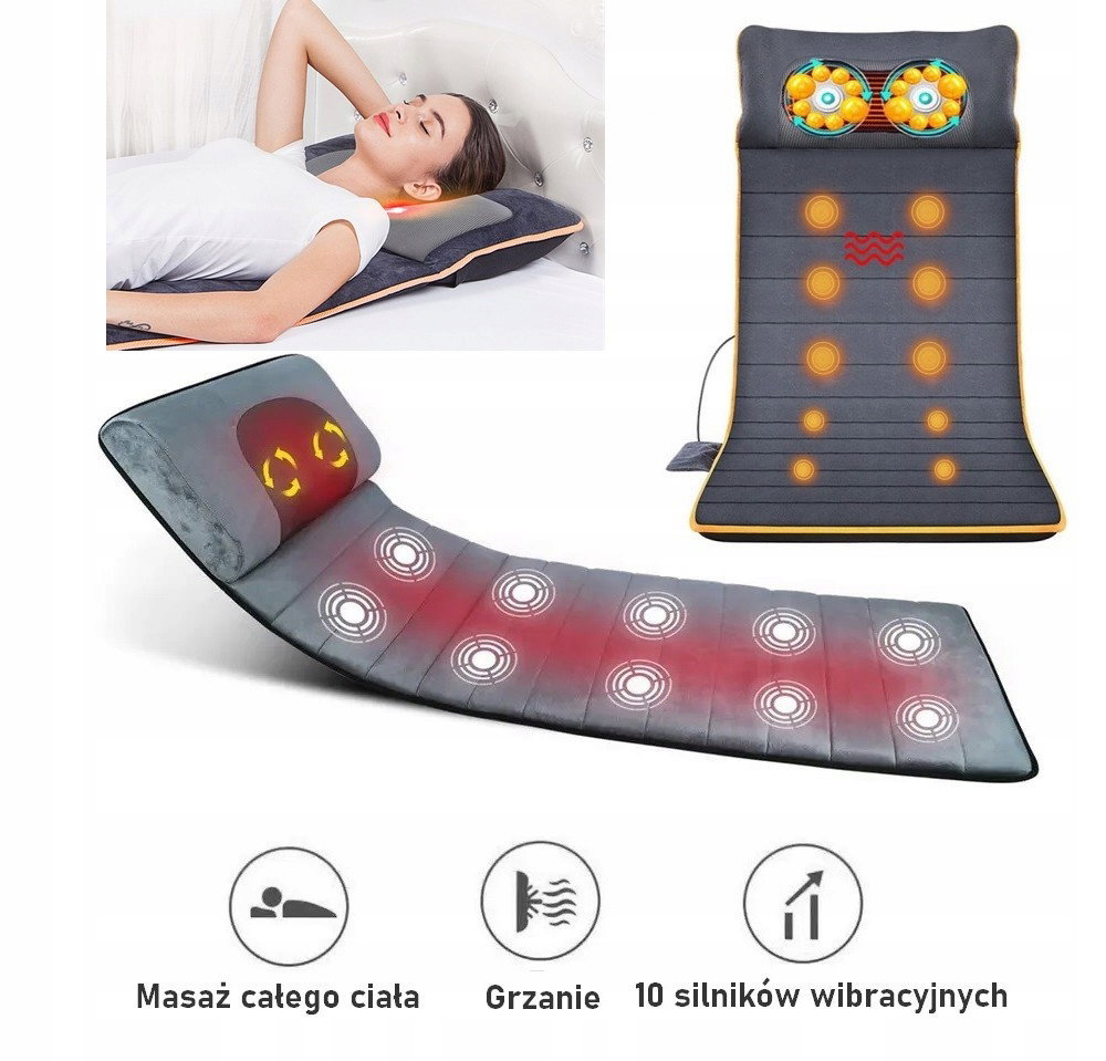 Mata masująca - Materac masujący posiada funkcję masażu wibracyjnego system grzania i rolki Shiatsu masujące kark. Cały system masażu pomaga rozluźnić mięśnie i złagodzić ból. Nasza mata masująca wyposażona jest w pilot zdalnego sterowania umożliwiającą łatwe dostosowywanie intensywności i rodzaju masażu. Może być używany do masażu całego ciała lub tylko wybranych części, takich jak kark, plecy lub nogi.