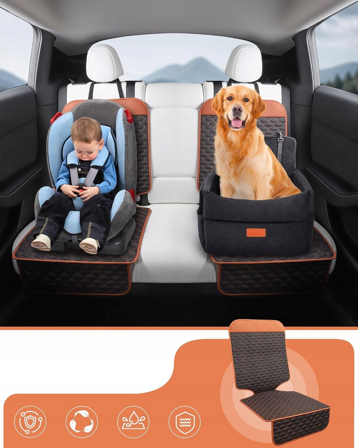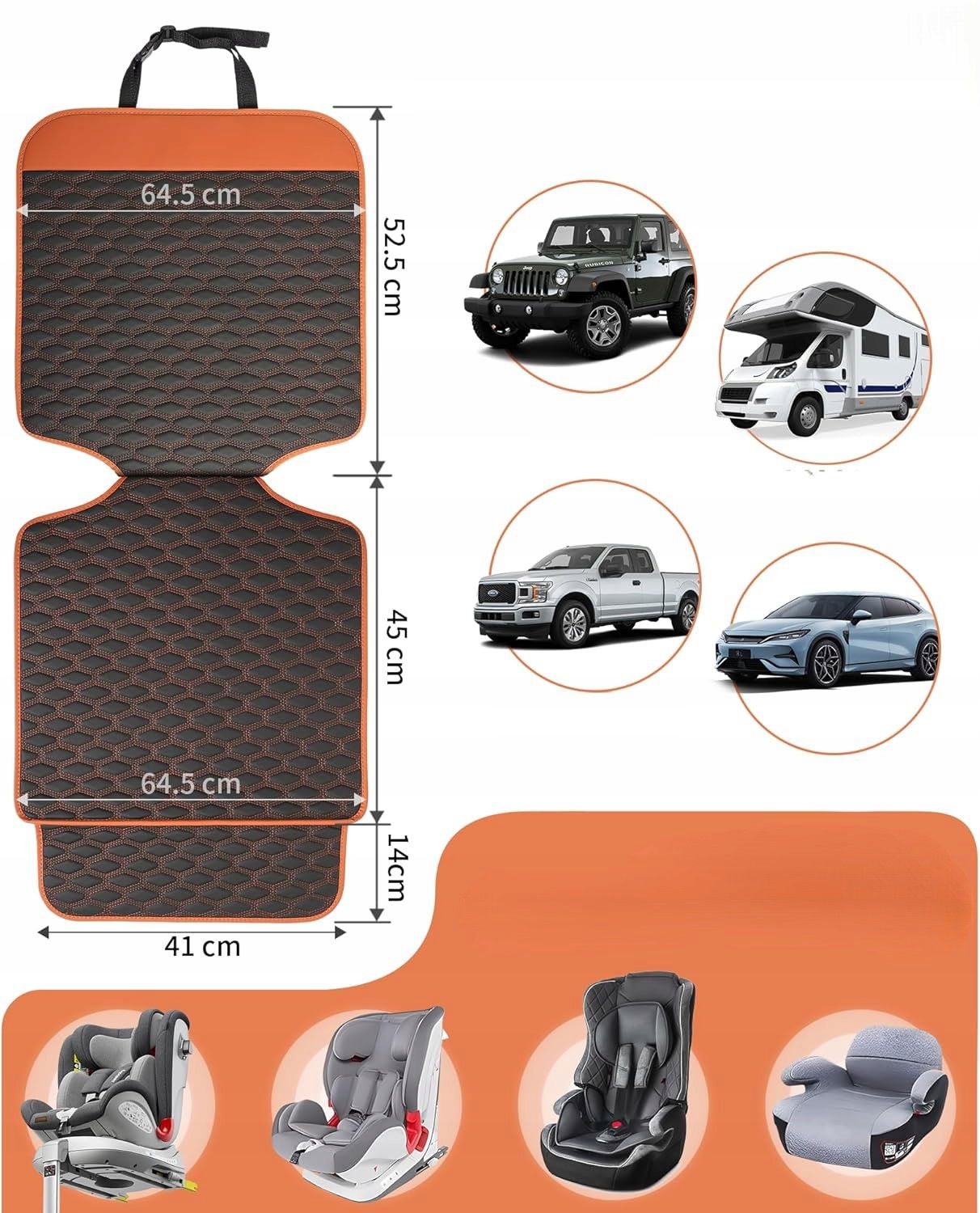 Mata ochronna pod fotelik samochodowy marki EVMODS to praktyczne rozwiązanie dla każdego rodzica dbającego o stan tapicerki pojazdu. Produkt o wymiarach 45 x 64,5 cm i wadze 1 kg wykonano z wysokiej jakości materiału imitującego skórę, który przewyższa standardową tkaninę Oxford pod względem grubości, wytrzymałości i odporności na uszkodzenia. Model SC-006 dostępny jest w kolorystyce pomarańczowo-czarnej i charakteryzuje się trzema kluczowymi cechami: wodoodpornością, antypoślizgowością oraz odpornością na zarysowania.