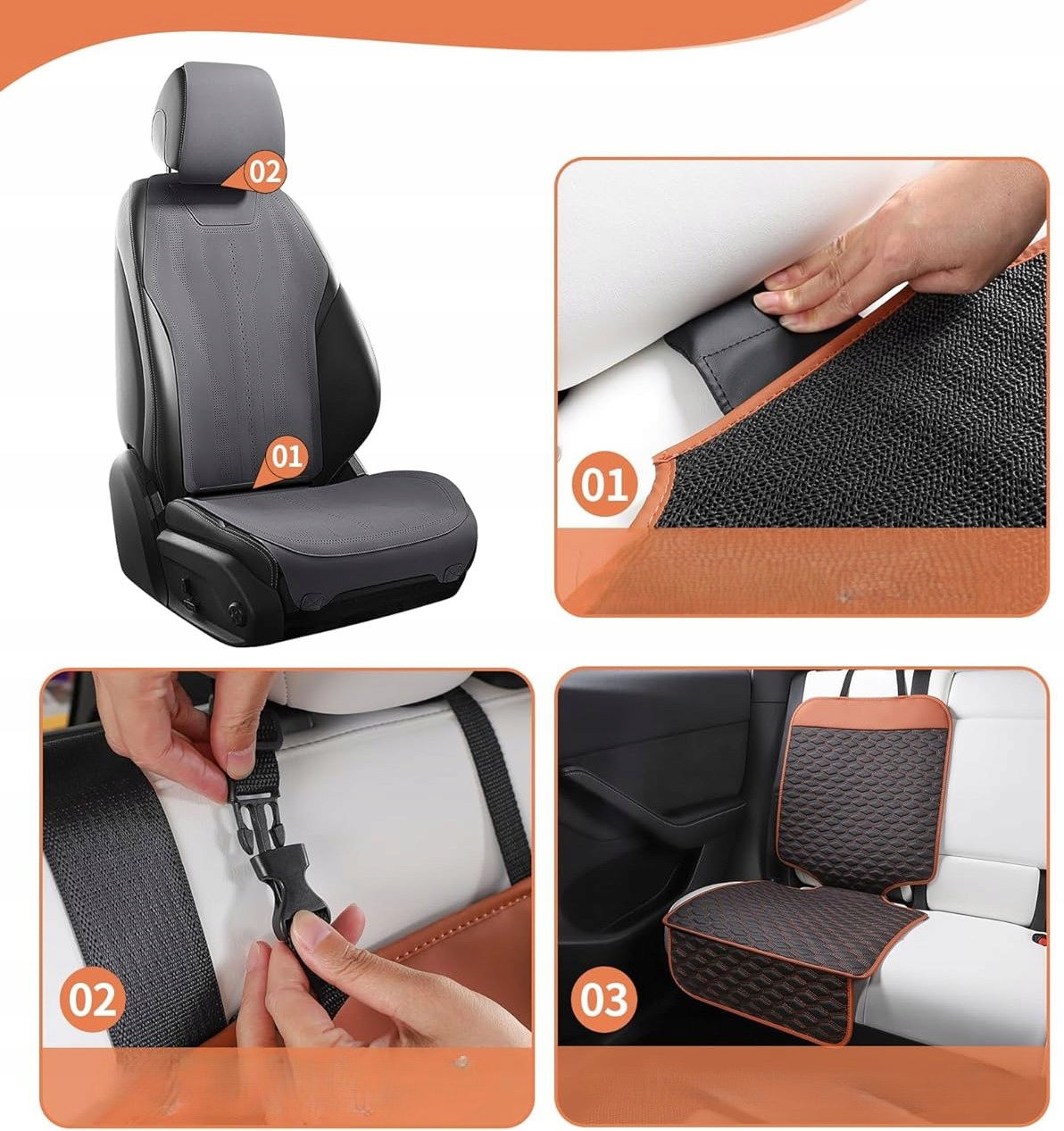 Specjalna antypoślizgowa warstwa dolna gwarantuje, że mata pozostaje nieruchoma nawet podczas dynamicznej jazdy. Instalacja jest niezwykle prosta – wystarczy wsunąć klin maty w szczelinę siedzenia i zapiąć górne klipsy. Cały proces zajmuje dosłownie chwilę, a efekt to pewne i stabilne zamocowanie bez konieczności użycia dodatkowych narzędzi. Produkt oferuje połączenie funkcjonalności, estetyki i trwałości, które docenią wymagający użytkownicy szukający niezawodnego zabezpieczenia tapicerki samochodowej.
