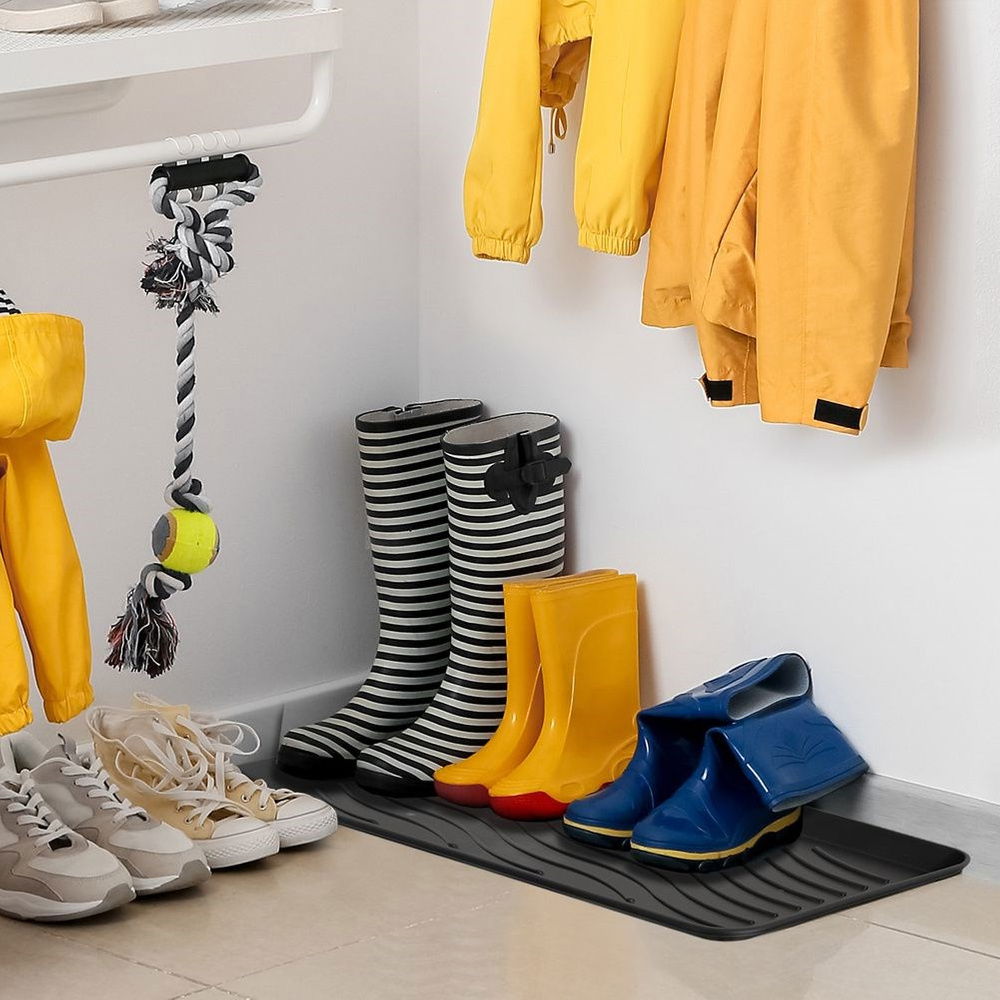 PRAKTYCZNA - Podstawka na buty w prostokątnym kształcie o wymiarach 77,5 x 38 x 2,5 cm. Idealna do zabezpieczenia podłogi przed różnego rodzaju zabrudzeniami.