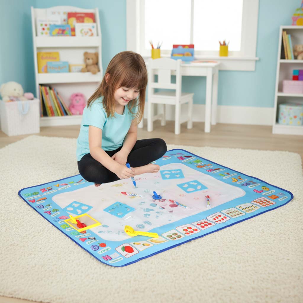 TWÓRCZA ZABAWA BEZ BAŁAGANU - Ta mata wodna do malowania to idealne rozwiązanie dla dzieci, które uwielbiają tworzyć. Malowanie odbywa się wyłącznie przy użyciu wody – wystarczy napełnić pisaki i rozpocząć zabawę! Rysunki pojawiają się w intensywnych kolorach, a po wyschnięciu znikają, pozostawiając matę gotową do kolejnego użycia.