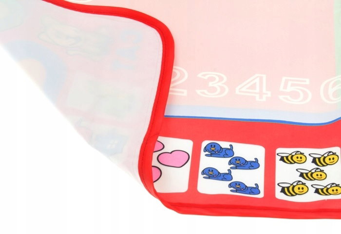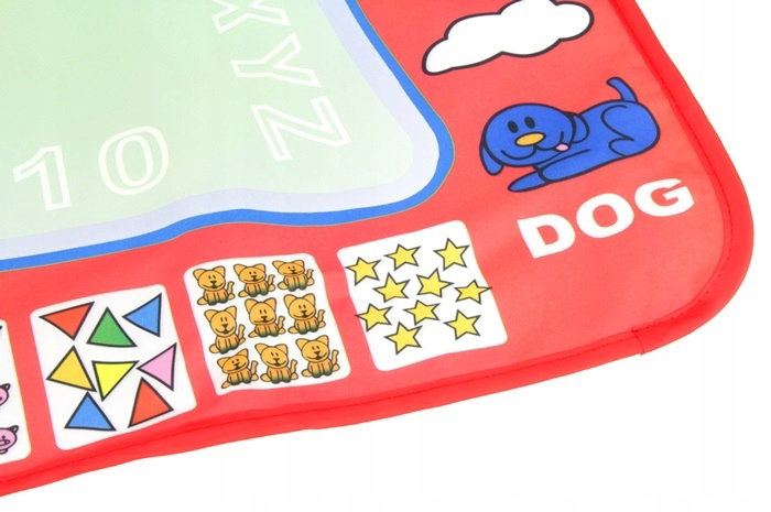 Wokół pola do malowania umieszczone są kolorowe rysunki podpowiadające jak łatwo namalować np. autko, pieska, świnkę, chmurkę, słońce. Przy obrazkach ze zwierzątkami znajdują się ich nazwy w języku angielskim. Podczas zabawy dziecko poznaje kształty, kolory, cyferki oraz literki.