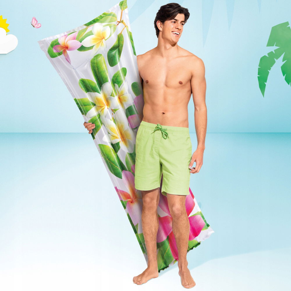 Wypoczynek nad wodą daje dodatkową radość dzięki dmuchanemu materacowi. Jego zaletą jest wygodne oparcie z zagłówkiem. Materac jest wykonany z odpornego na uszkodzenia materiału PVC. Jego elastyczność dodatkowo amortyzuje uderzenia i tym samym zmniejsza ryzyko przedziurawienia. Ciekawe, kolorowe wzornictwo zwraca uwagę i pozwala na szybką lokalizację materaca. Łatwe nadmuchiwanie umożliwiający zawór powstrzymujący uciekające powietrze