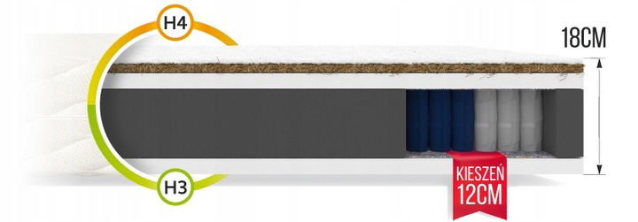 MATERAC KIESZENIOWY Z KOKOSEM RODZINNY 180 X 200 X 18 WYSOKI KOKOS H4 H3