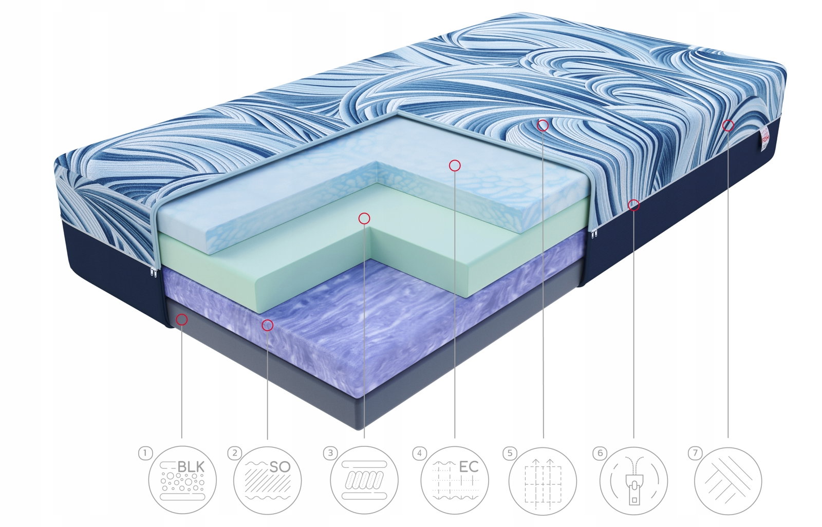 Pianka elastyczna, która doskonale podtrzymuje ciężar. Dzięki niejednolitej strukturze uzyskuje się lepsze parametry podtrzymywania ciała oraz wspomaga przepływ powietrza w materacu.