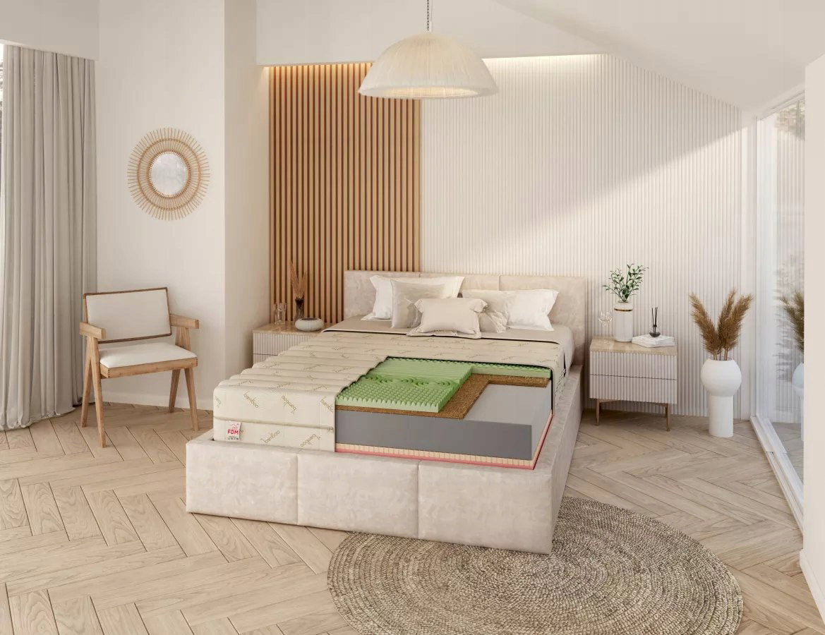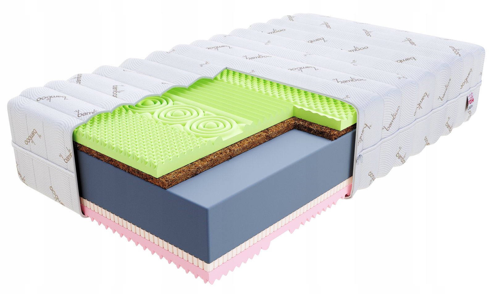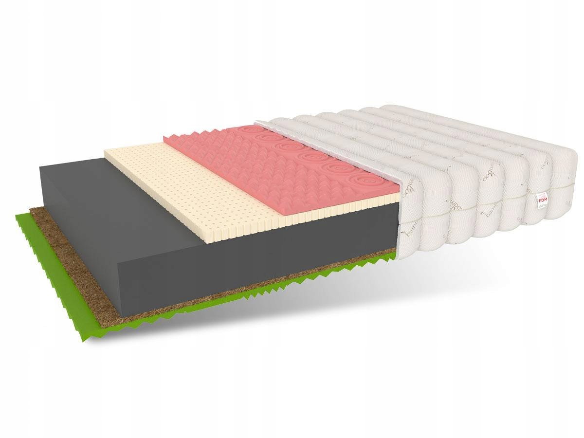Dla zapewnienia odpowiedniego komfortu jedną stronę materaca tworzy 7-strefowa, profilowana pianka wysokoelastyczna HR oraz mata kokosowa, która usztywnia powierzchnię. Dzięki temu połączeniu uzyskujemy stronę twardszą, która świetnie dopasowuje się do ciała, rozluźniając newralgiczne punkty w ciele. Natomiast druga strona posiada warstwę lateksu oraz profilowaną piankę termoplastyczną VISCO z funkcją pamięci kształtu. Dzięki kombinacji tych dwóch elementów możemy być pewni, że każda noc będzie pełna relaksu i odpowiedniego wypoczynku.