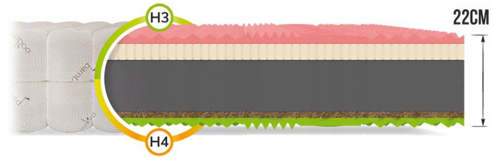 Rozmiar: 140x200 cm ‖ Wysokość: 22 cm ‖ Twardość: ↥ H4 - materac twardy ↧ H3 - materac średnio twardy