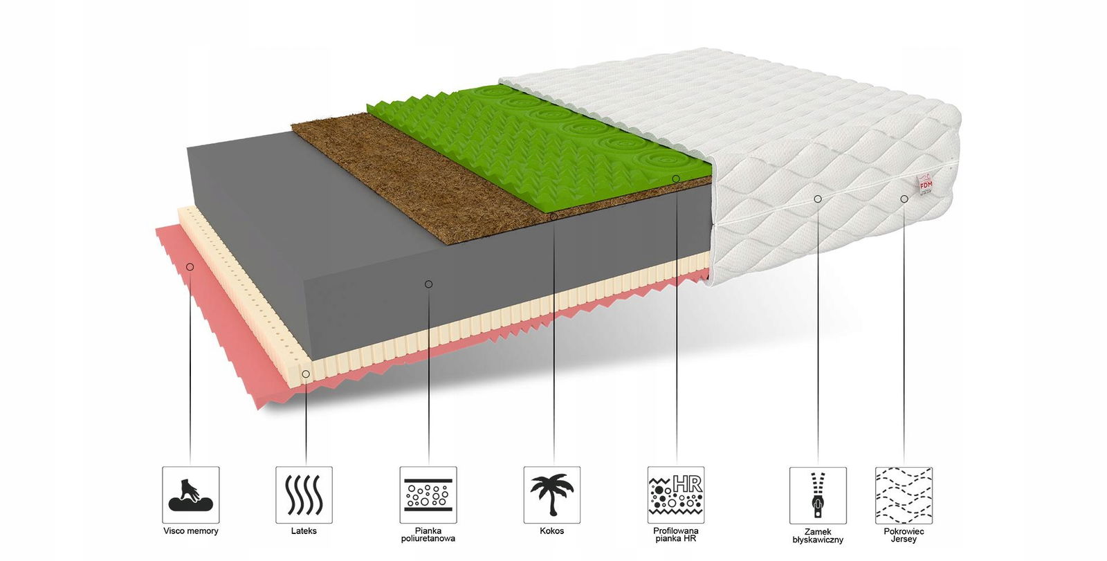 Profilowana powierzchnia dzieli materac na 7 stref, zapewniając idealne dopasowanie materaca do kształtu ciała. Specjalna struktura tego surowca sprawia, iż reaguje on na temperaturę i siłę nacisku. Warstwa ta przyjmuje dokładnie taki kształt, JAKi posiada osoba, która się na niej położy. Daje kręgosłupowi naturalną pozycję i oparcie. Idealna dla osób z bólami kręgosłupa. Dzięki swoim właściwościom zapobiega powstawaniu odleżyn oraz poprawia krążenie krwi.