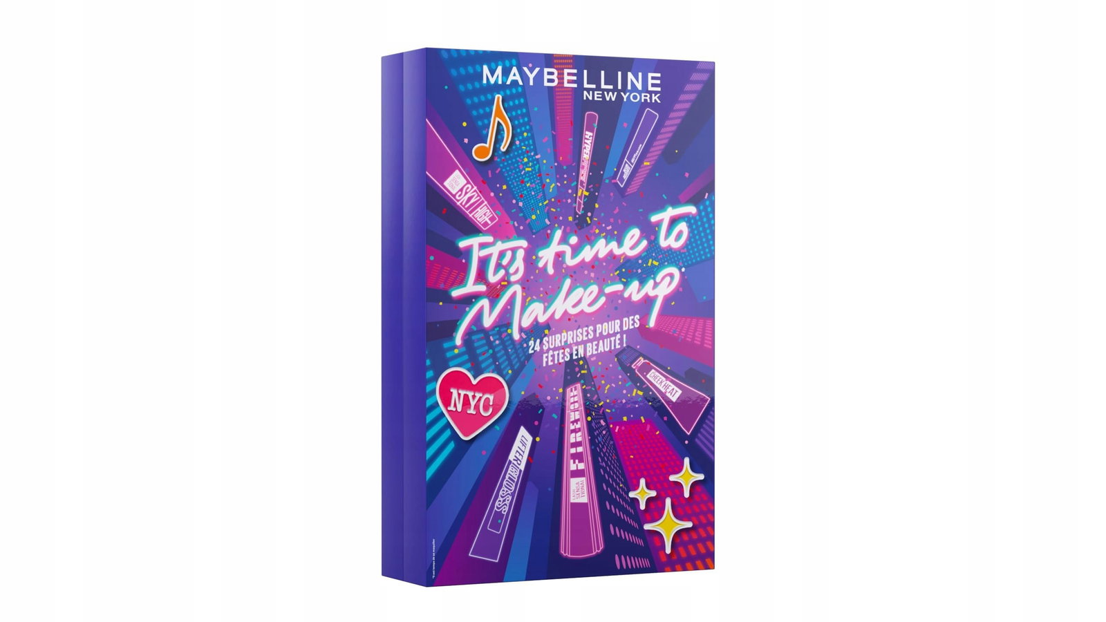 Zawartość: 1 x kalendarz adwentowy 2024, zestaw 24 pełnowymiarowych produktów do makijażu, marka : Maybelline New York