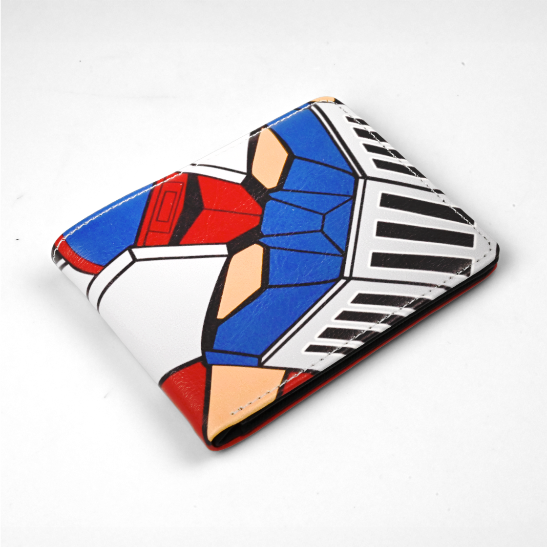 Kiedy Mazinger Z rusza do walki, od razu czuć tę retro moc i klimat złotej ery mecha—i właśnie to daje portfel Mazinger, który możesz nosić na co dzień. Ma 13 cm, więc jest poręczny i kieszonkowy, ale dzięki mocnym kolorom i klasycznemu stylowi od razu pokazuje, że jesteś fanem kultowych gigantów i oldschoolowej animacji. Zewnętrzna ekoskóra łączy głęboką czerń, intensywną czerwień i jasną biel w wyrazistych blokach kolorów z ostrą, czystą kreską—jak zbliżenie na pancerz robota. Na jednej stronie masz logo Mazinger Z w energetycznych pomarańczach na czerwonym tle, a na drugiej mocno graficzny układ „twarzy” mecha: intensywny niebieski, ciepłe żółte akcenty i kontrastowe czarne pasy przypominające wloty lub kratownice. Nadruk jest gładki i lekko połyskujący, a równe przeszycia na brzegach trzymają całość w ryzach i dodają porządnego wykończenia. W środku czeka czarne, praktyczne wnętrze: okienko na dowód, miejsca na karty, przegroda na banknoty i kieszonka na suwak na monety lub drobiazgi. Na dojazdy, konwenty albo po prostu jako upgrade codziennego „EDC”—ten portfel ma funkcję i styl prosto z klasycznych super-robotów. Wrzuć go do swojej kolekcji i noś mecha klimat z dumą.
