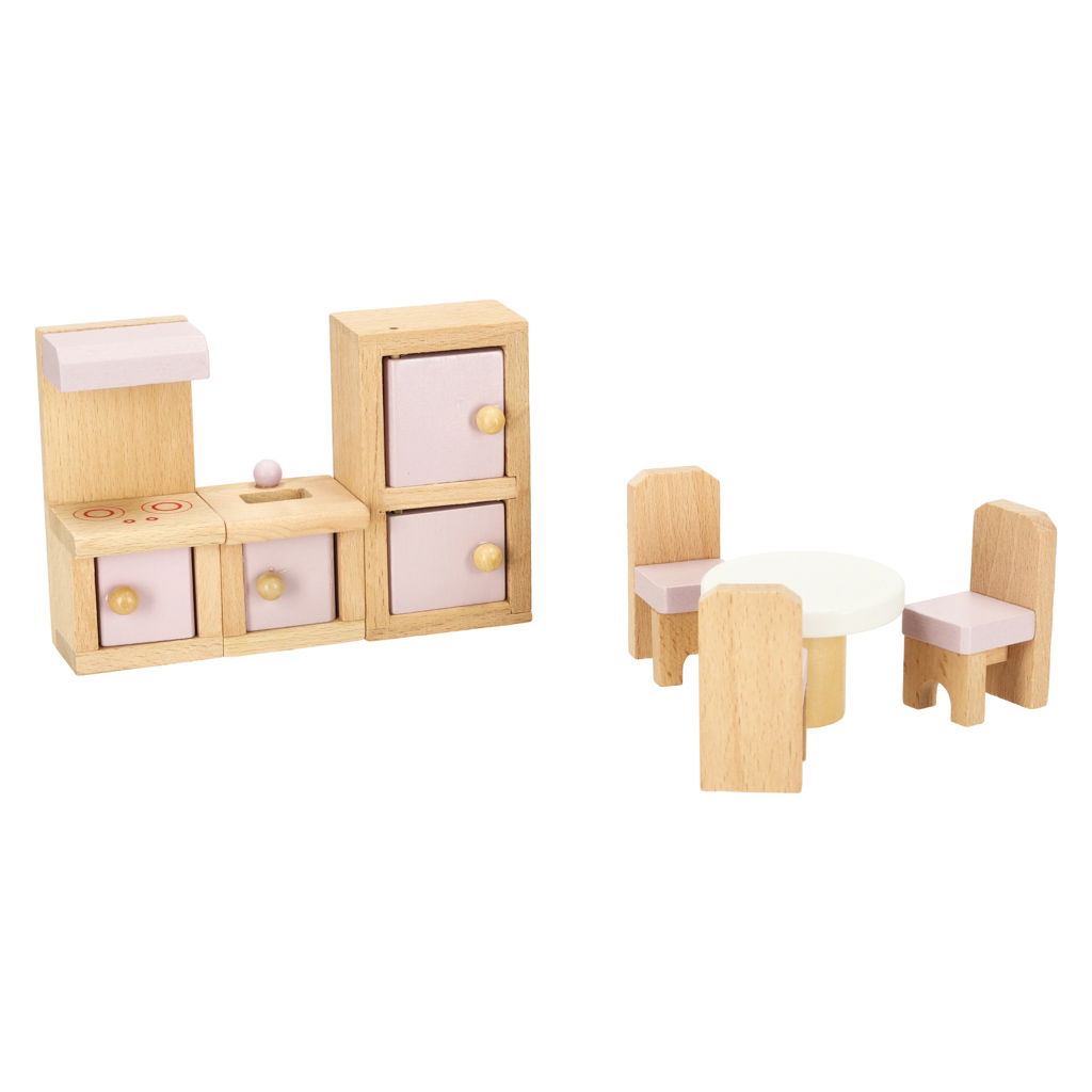 Wszystkie elementy są wykonane z naturalnego drewna, co zapewnia trwałość i odporność na zniszczenia. Drewniane mebelki są bezpieczne dla dzieci i przyjazne dla środowiska, będąc jednocześnie estetycznym dodatkiem do każdej zabawy. Elementy są wykończone bezpiecznymi farbami w białym i różowym kolorze.