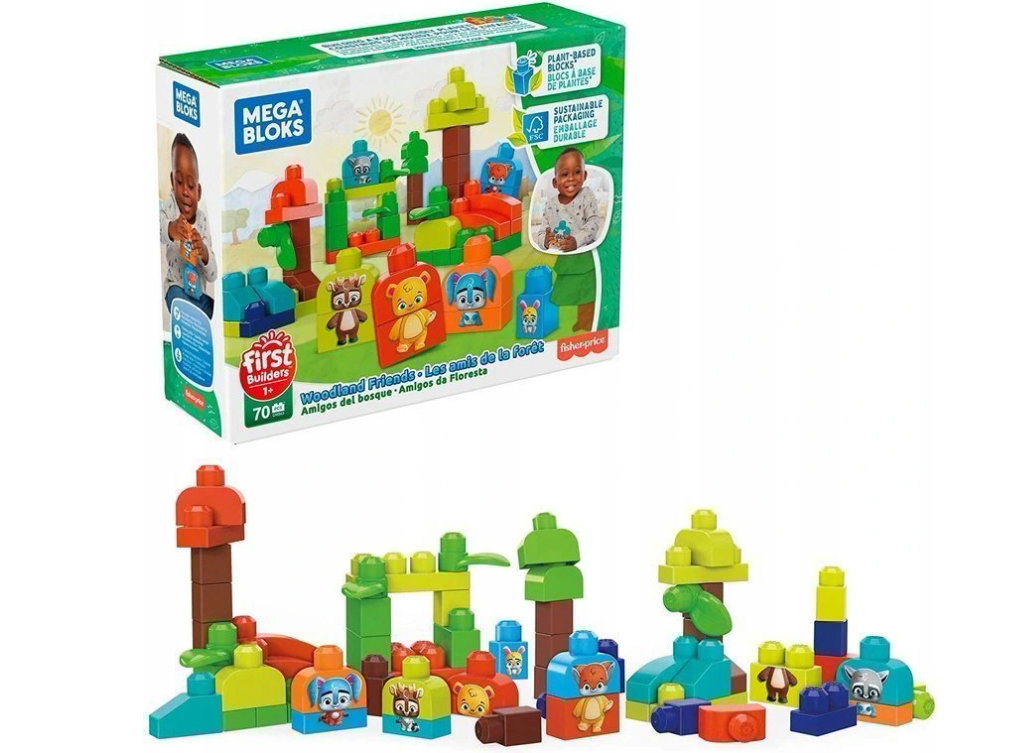 Klocki wykonane z dobrego jakościowo i bezpiecznego tworzywa sztucznego pochodzenia roślinnego. Zestaw konstrukcyjny Przyjaciele z Lasu zawiera 70 dużych klocków zaprojektowanych z myślą o trwałości i jest kompatybilny ze wszystkimi zabawkami Mega Bloks First Builders, zapewniając niekończącą się zabawę podczas nauki. Maluchy zbudują leśne środowisko i dopasują klocki z wydrukowanymi obrazkami zwierząt, aby zbudować niedźwiedzia, lisa, szopa, królika i jelenia.